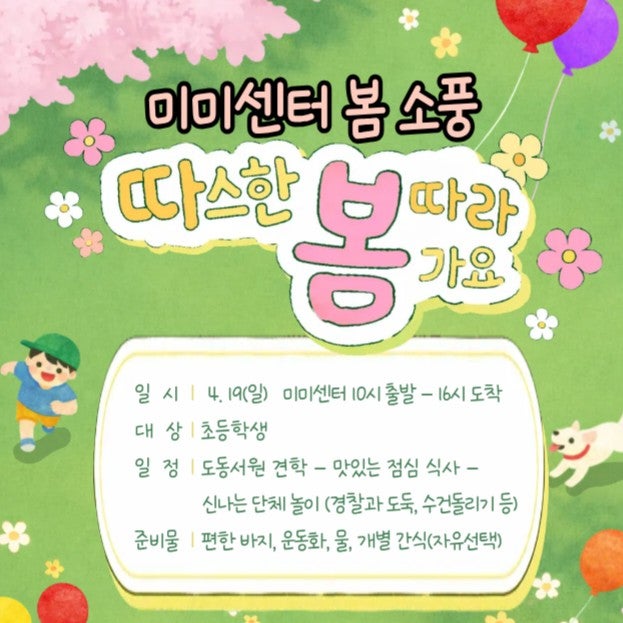 2026년 미미센터 봄소풍 확정! 소풍 목적은_ 도동서원 역사탐방/ 맛있는 점심/ 쾌적한 강당에서 실내활동/ 실외활동을 통해 또래 친구들 선생님들과 친목도모, 신나게 놀기 입니다! 안전과 퀄리티를 위해 3.10(화) 12:30분 소수 20여명만 선착순으로 모집합니다. https://blog.naver.com/memeartcenter/223601829980 <img src="https://blogthumb.pstatic.net/MjAyNjAzMDhfMjE1/MDAxNzcyOTQwMjMyNTE5.oD_DiSgLdxJWxGxXBAuTvYbbpcfA9ROclUaBLWtoqp0g.gBikpsYwYlfqAmlqxu4Xg8t4y_iM7i7AD98HVJDQTPkg.JPEG/1772940232055.jpg?type=s3" />