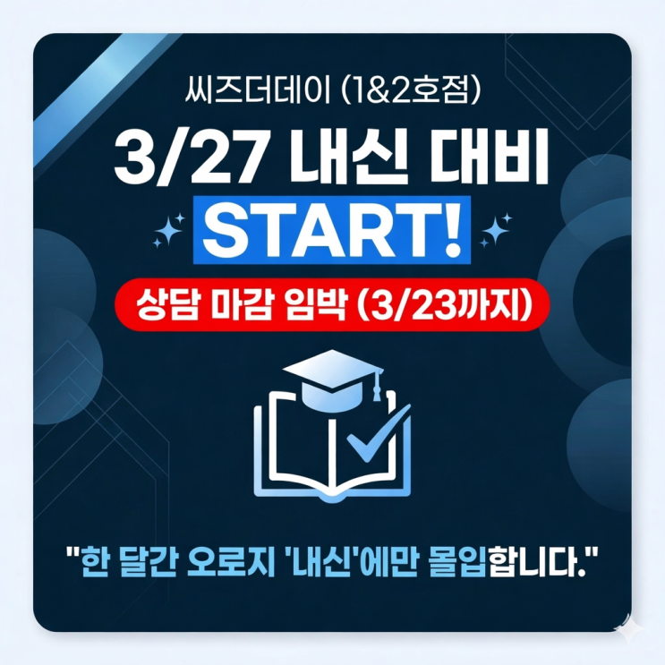 안녕하세요:-) 내신대비 기간 공지 입니다! 약 한 달간 신규 상담은 받지 않으니 양해 부탁드립니다:-) 재원생에게 집중하겠습니다 !!! <img src="https://blogthumb.pstatic.net/MjAyNjAzMjBfMTQ5/MDAxNzczOTk2NzIxMDMy.xskZXvmJAyt5A-d8CH3gwCIUtNe-fLynng2_p5hUr3sg.GRHlc5zrpBjHqop9QZTKgaEIp2bG_-lYbA4aeeXXxEwg.PNG/ChatGPT_Image_2026%B3%E2_3%BF%F9_20%C0%CF_%BF%C0%C8%C4_05_51_30.png?type=s3" />