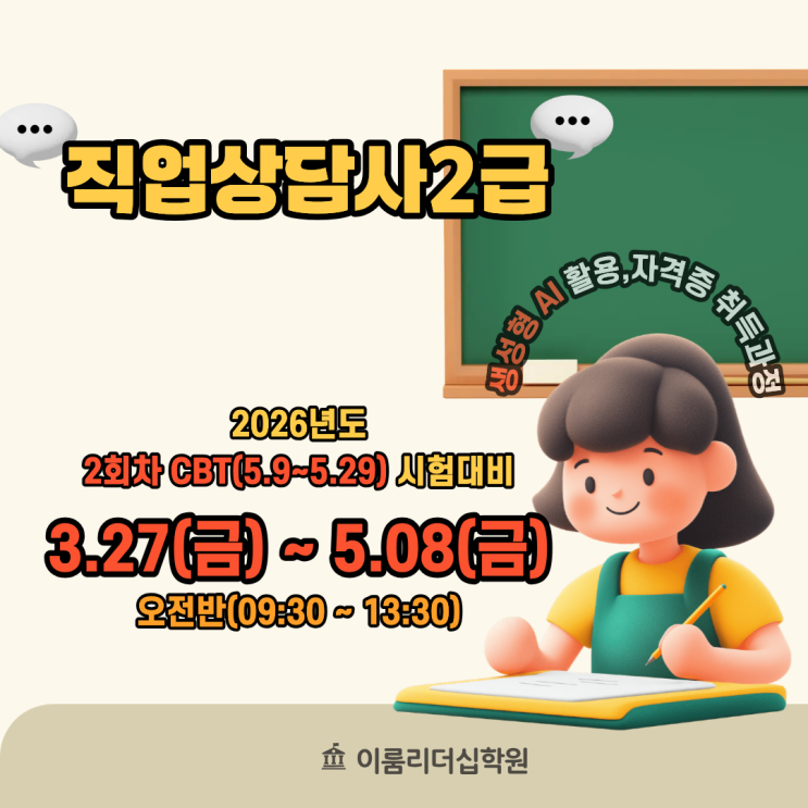 #직업상담사2급 #재취업여성 #경력단절여성재취업 #직업상담사과정 #고용센터취업 #새일센터취업 #상담직재취업 #오전반수업 #자격증재취업 #현실적인재도전 경력단절 이후 다시 일을 시작하려 할 때, 많은 분들이 가장 먼저 고민하는 것은 “할 수 있을까”가 아니라 “지금 내 생활을 유지하면서 가능한 일인가”입니다. 그래서 재취업을 고민하는 여성분들 사이에서 직업상담사 2급은 꾸준히 관심을 받는 자격증입니다. 하지만 동시에 이런 질문도 따라옵니다. “자격증만 따면 바로 일할 수 있을까요?” “공부 난이도는 감당할 수 있을까요?” “현실적으로 나에게 맞는 선택일까요?” 이 질문들에 솔직하게 답하지 않으면, 과정은 시작돼도....... <img src="https://blogthumb.pstatic.net/MjAyNjAyMjhfMjEw/MDAxNzcyMjYxNzYwOTE2.d1PGwjbBRuVhFXKyZdpvsvZWv2ZJrxkA9a2y_ivBfdkg.GneSYpz9mijVRpePZCL8ySqGlnC837V0KOOCsST-8rUg.PNG/%C1%F7%BE%F7%BB%F3%B4%E3%BB%E7.png?type=s3" />