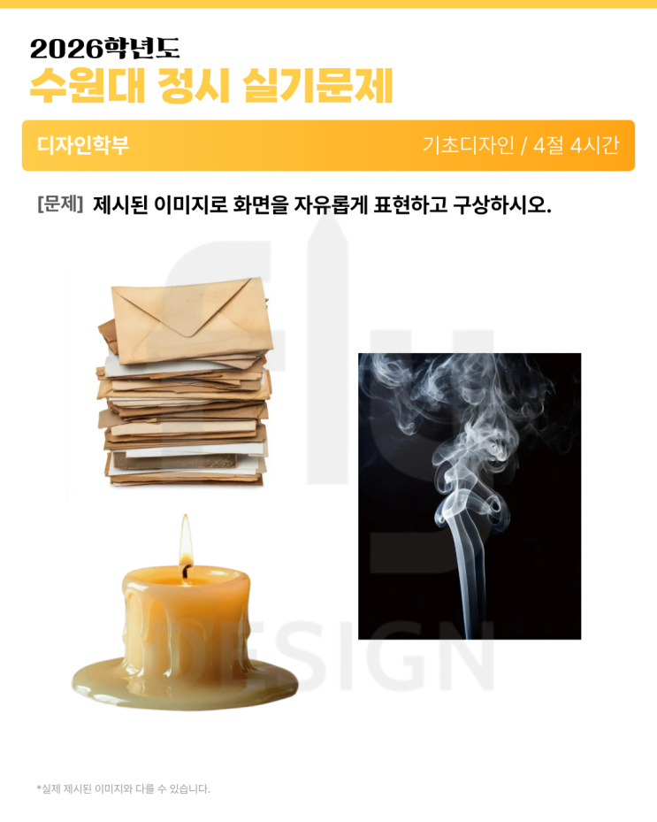 2026학년도 수원대학교 미대 정시 기출문제 인천 플라이미술학원 안녕하세요~ 인천 플라이미술학원의 루다쌤이에요! 오늘은 2026학년도 수원대학교 미대 정시 기출문제를 알려드릴게요! 올해 정시 기출과 정기 경쟁률까지 한번에 확인해볼거예요. 그럼 지금부터 시작해볼까요? 2026학년도 수원대 정시 실기문제 디자인학부 기초디자인 [문제] 제시된 이미지로 화면을 자유롭게 표현하고 구상하시오. 2026학년도 수원대 정시 실기문제 디자인학부 발상과 표현 [문제] 당신을 기쁘게 하는 소리를 떠올린 뒤 그 소리를 시각화하여 조화롭게 화면을 구성하시오. 2026학년도 수원대 정시 경쟁률 2026학년도 수원대 정시 경쟁률입니다. 올해부터 디자인....... <img src="https://blogthumb.pstatic.net/MjAyNjAyMTBfOTEg/MDAxNzcwNzA3MzA2Njk1.Uqfp-3QslsZCsbfaAKklIUG5KIwxz5dV14Q3E4IgcJwg.CugmbodTIAiIp03ZabgSR43N7ylbJbrxJhpYWp9cX98g.PNG/1.png?type=s3" />