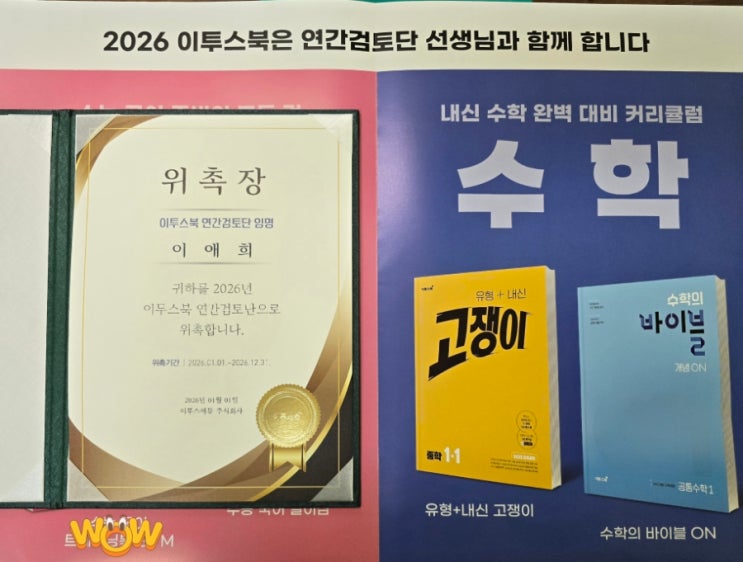 2026 이투스북 연간검토단으로 선정되어 작년에 이에 올해도 계속 활동합니다. 22개정교육과정으로 개정된 도서의 검토단으로 참여한 도서에 에이탑수학 혹은 에이탑수학으로 바뀌기전 부평해법수학교실의 이름이 함께 실려 출간되었네요. 개정검토에 참여한 도서들을 보니 뿌듯하고 여러 학생들에게 도움이 되길 진심으로 바래봅니다. <img src="https://blogthumb.pstatic.net/MjAyNjAxMTZfMjAz/MDAxNzY4NTUyMDk1Njgy.oY2goQx_gSSTaS7yXQWaAoQ0Ny1X1BodiA_YyaTVnsgg.AvtTTY2V11pfR1uqddqj7CirxxgtIntezk3Y4yAijQMg.JPEG/900%A3%DF20260116%A3%DF164615.jpg?type=s3" />