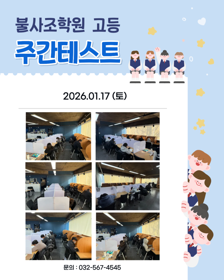 안녕하세요 중고등 입시학원 불사조 학원입니다. 1월 17일 토요일에 진행한 중등부 주간테스트 입니다 고등부 학생들이 매주 토요일마다 열심히 공부하고 테스트를 보고 있어요 #가좌동학원 #가좌고입시학원 #가좌동입시학원 #서구입시학원 #가좌동중등학원 #가림고학원 #가좌고학원 #가좌동중등학원 #가좌동중등영어 #가좌동중등수학 #가좌동국어 #가좌동고등국어 #가좌동고등수학 #가림고 #가좌고 <img src="https://blogthumb.pstatic.net/MjAyNjAxMjBfMTU1/MDAxNzY4ODg5NTI0NDc3.RXkntX5HckRzPXMq8uNwjX039OdhkjZgb51z-OGu__4g.jytzvegKIsMSnfX4tOqi51qV-9fOL_1NJN6SRSFnb70g.PNG/1.17.png?type=s3" />
