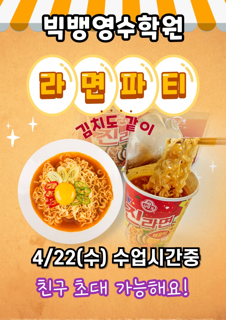 지난 금요일 초등 친구가 라면먹고 싶다고하더라구요^^ "그럼 같이 한번 먹을까?" 로 시작된 라면파티♪♪♪ 라면은 다양하고 많을수록 좋죠~~ 라면만 준비하면 넘 심심^^ 아이들 영양을 생각해서 메추리알, 김치, 단무지, 방울토마토도 같이 준비했답니당♥♥♥ 우리 아이들 넘 잘 먹네요~ 역시 라면은 거부할수 없죠^^ 라면 먹고 영어, 수학도 같이 했답니당 물론 아이들은 싫어하기 했지만요~~ 소소한 작은 이벤트 하나로 우리 아이들의 행복이 플러스 되는거 같네요♥♥ 테스트와 상담은 예약제로 진행됩니다. 궁금한 부분이 있으시면 빅뱅영수학원으로 연락주세요~~ (주말 테스트도 가능해용‼️) (최근 포스팅한 내용이 궁금하시....... <img src="https://blogthumb.pstatic.net/MjAyNjA0MjJfNjgg/MDAxNzc2ODUwMDQ2MjUy.7wYQtRXYVLzw7ylu04n8lUkF-Ig-uhuqkKB6lJDJ-ngg.nTn_A60QjzlmEiyiI77JgwHiTbIiK2M3mbkaGKkUZVQg.JPEG/%B6%F3%B8%E9%C6%C4%C6%BC.jpg?type=s3" />