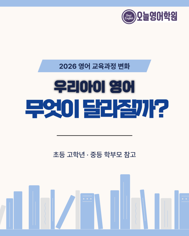 안녕하세요. 오늘영어학원 원장입니다. 2026 영어 교육과정이 바뀐다는 말은 들었지만, 우리 아이 기준으로 뭐가 달라지는지 헷갈리는 분들 많으시죠? 바뀐다는 말은 들었는데 그래서 영어는 어떻게 해야 해요? 하는 질문을 현장에서 많이 받습니다. 그래서 이 글에서는 현장에서 실제로 도움이 되는 기준으로 2026 초중등 영어 교육 변화의 핵심을 정리해 보았습니다. 2026 영어교육과정의 핵심 변화 기존 영어는 듣기·말하기·읽기·쓰기 네 기능을 기능별로 분류해 따로 다뤘다면 2026 교육과정은 1. 이해: 듣기 + 읽기 + 보기(Viewing) 2. 표현: 말하기 + 쓰기 + 제시(Representing) 으로 개편했습니다. 그리고 디지털· AI 교육 환경을 고려한....... <img src="https://blogthumb.pstatic.net/MjAyNjA0MjNfMjUw/MDAxNzc2OTAxMzI5ODY4.hRhumRsepqH0SMWk4i-mT-8TMhze_cw8d_0o4NFwnDUg.b1UFkUQ-ba_PBzDH3vI11aU6RY5kLwRZ9XJ6PAVgth0g.PNG/1.png?type=s3" />