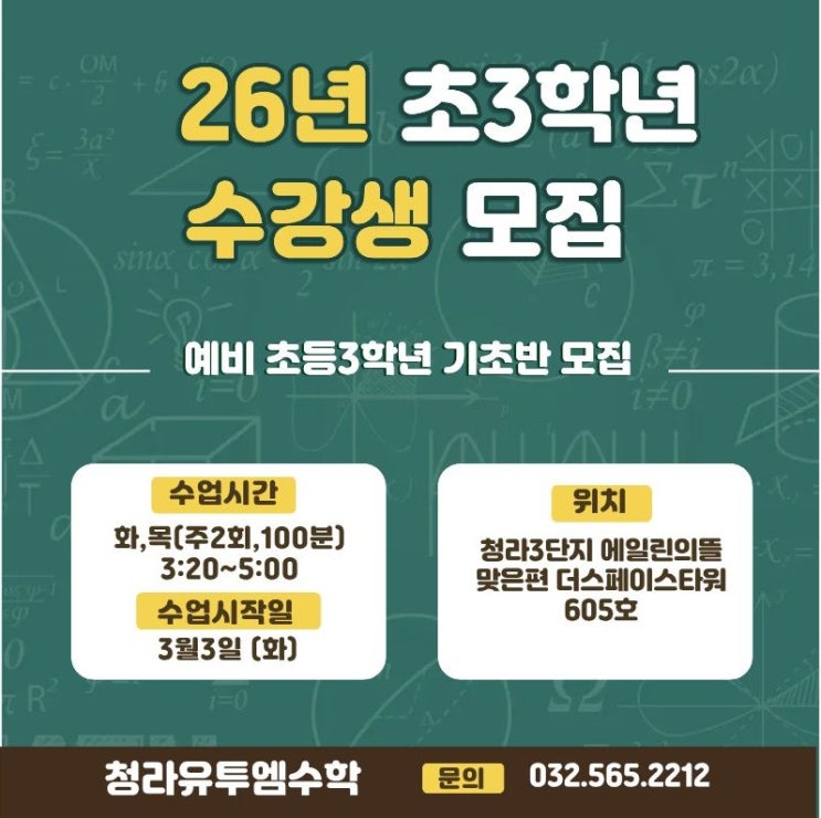 안녕하세요. 청라유투엠 수학학원입니다. 26년 3월 봄학기를 맞이하여 개강하는 반과 추가모집하는 반이 있어 안내드리려고 합니다. 또한, 유투엠에서는 초3부터 중학교3학년을 대상으로 추가모집 레벨 테스트를 무료로 진행하고 있으니 관심있는 학부모님께서는 부담없이 이번기회에 꼭 응시하셨으면 합니다. 레벨테스트 후 원장님이 직접 상담까지 진행하고 있으니 많은 신청 부탁드립니다. 유투엠수학인 올림피아드 교육에서는 AI가 진단한 레포트도 함께 받아보실수 있습니다. 새로 개강하는 초3반과 T/O가 있는반을 아래와 같이 안내하오니 참고하시기 바랍니다. - 초3반 (첫 시작반) 화, 목 수업 : 3시20분 ~ 5시 (주2회, 100분 수업) - 초....... <img src="https://blogthumb.pstatic.net/MjAyNjAxMjNfMTI4/MDAxNzY5MTU2NTY3Mzg1.KGLlBx-24DJZp3YE8zsnt5Agg22cgyGqEZ2uErSfdWwg.YhpYv9bx21JJBolefz6MArkw8wWEzHmcLeNdOidkrVMg.JPEG/KakaoTalk_20260122_173901034.jpg?type=s3" />