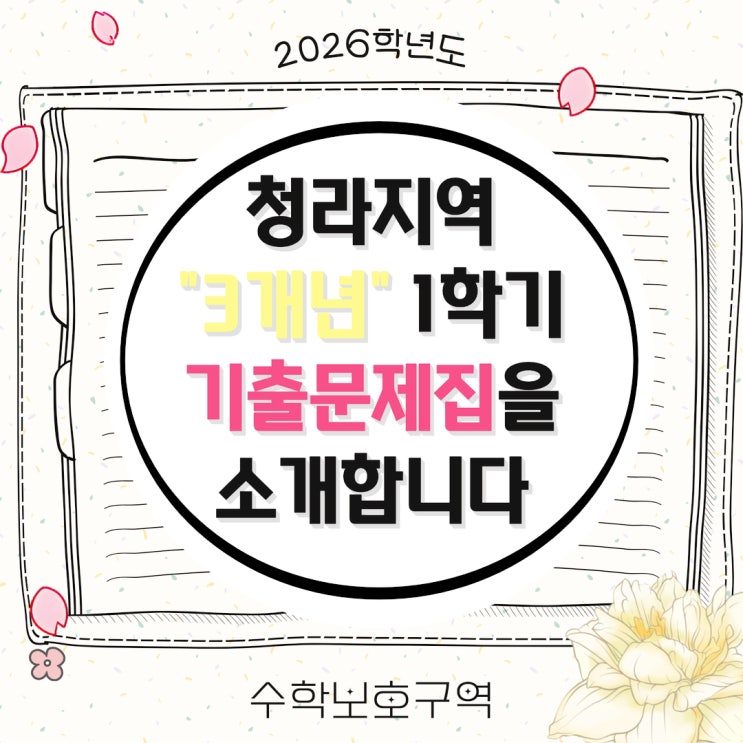안녕하세요. 수학보호구역 학원입니다. 어느덧 2026년이 시작되었고, 설레는 새학년 새학기가 다가오고 있습니다 새학기를 맞이하면서 새로운 시작에 대한 설렘과 기대가 함께하지만, 곧 다가올 지필고사의 부담도 함께 느껴지기 마련입니다. 수학보호구역 학원에서는 1학기 중간고사와 기말고사를 대비하여 청라지역 학교 기출문제들로만 구성된 1학기 시험 대비 교재를 제작하였습니다. (중2:828문항 / 중3:697문항/ 고1:679문항/ 고2:624문항) 청라 인근 지역 학교들의 3개년 기출문제들을 단원별 & 난이도별로 편집, 제작하였습니다. 기출 문제들을 단원 & 난이도별로 한문제 한문제 풀어보면서 1학기 중간고사와 기말고사를 준비한....... <img src="https://blogthumb.pstatic.net/MjAyNjAyMTBfMjA2/MDAxNzcwNzI4OTY4NTcw.wG7JD92NMLe8sJ37hc3EIvy2Mqnm2j6aLtql8naXN_sg.XLZVOYn-SIXfp45fY1ET9XO_2dlrHgKO7_9EaLpxh1Eg.JPEG/%C1%A6%B8%F1%C0%BB_%C0%D4%B7%C2%C7%CF%BC%BC%BF%E4_%2813%29.jpg?type=s3" />