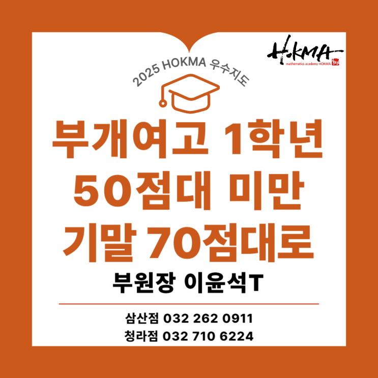 안녕하세요. 삼산동 수학학원, 호크마수학학원입니다. 고등학교에 올라오면 많은 학생들이 처음으로 수학의 벽을 실감합니다. 중학교 때는 성실함만으로도 버틸 수 있었지만, 고등 수학은 이해와 응용력이 따라주지 않으면 점수로 이어지지 않습니다. 첫 학기 성적이 50점 이하로 떨어지면서 자신감을 잃는 경우도 적지 않죠. 하지만 방향을 바로잡는다면 성적은 반드시 다시 올라옵니다. 오늘은 50점 미만에서 출발해 2학기 기말고사 70점대까지 끌어올린 부개여고 1학년 이OO 학생의 이야기를 들려드리려고 합니다. 삼산동 수학학원 호크마 부원장 이윤석 선생님의 고1 우수 지도 사례, 함께 살펴보겠습니다. Problem 부개여고 1학년 이OO 학생....... <img src="https://blogthumb.pstatic.net/MjAyNjAyMTJfNzQg/MDAxNzcwODI5OTA5MTA1.cyfsBMzJ3Mfgo47Dhpk_1IIRSVvVyLKMslqu67RoYFEg.TrmyqHamlT9AuNin66ySxbqpJSsq7M7xm988_vyKGuAg.PNG/001.png?type=s3" />