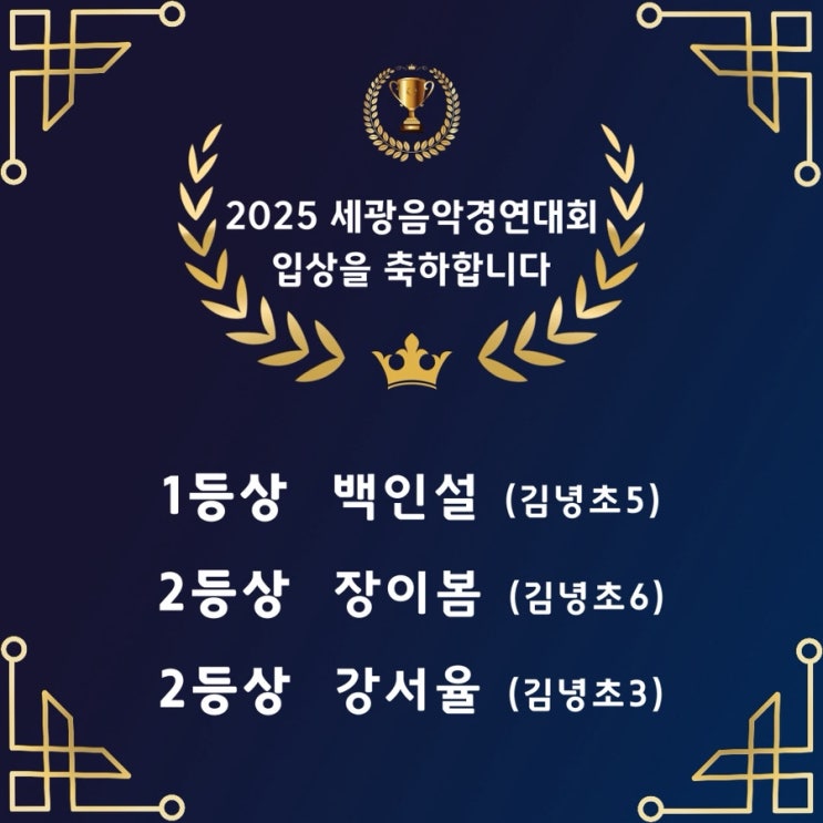 짜잔 우리 파란소리 친구들이 세광음악경연대회에서 입상을 하고 왔습니다! 축하해요 꾸준한 연습과 노력으로 이룬 값진 결과입니다. 학생에게 진심으로 축하의 박수를 보내며, 앞으로의 음악 여정도 따뜻하게 응원하겠습니다 <img src="https://blogthumb.pstatic.net/MjAyNTEyMTVfMjgg/MDAxNzY1NzY4MDE2NDQ2.sm8lSMYd4ru7iByPBib5JZEEN4qzbGqUr85coAVDPSIg.KC2jFyGGC0CUP1uWXvypNrqYJZiXdipjCvSFEyJV8Akg.JPEG/제목을-입력해주세요_-001(52).JPG?type=s3" />