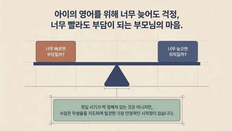 초등학생 학부모님들과 상담을 하다 보면 가장 자주 듣는 질문 중 하나가 있습니다. “영어학원은 언제부터 보내는 것이 좋을까요?” 아이의 영어를 위해 너무 늦어도 걱정이고, 너무 빨라도 부담이 될까 고민하는 부모님들이 많습니다. 그래서 정확한 시기를 궁금해하시는 경우가 많습니다. 결론부터 말씀드리면 영어학원을 보내는 ‘정답 시기’가 딱 정해져 있는 것은 아닙니다. 다만 실제로 학생들을 지도하다 보면 영어 학습이 가장 안정적으로 시작되는 시기가 있습니다. 바로 초등학교 1~2학년 시기입니다. 이 시기의 아이들은 새로운 언어를 받아들이는 데 부담이 적고, 영어에 대한 거부감도 거의 없습니다. 또한 학습량이 크게 늘어나....... <img src="https://blogthumb.pstatic.net/MjAyNjAzMTJfMTAz/MDAxNzczMjQyNTQyODM1.UARDO1Vi4tUMlWdsTV1CHSQ0jTQ3MUN8wwnz4i1aIGMg.B-SWA34i3pQurZhBMCrRs7zarsEVAo570yWUy3WtVeEg.JPEG/2.JPG?type=s3" />
