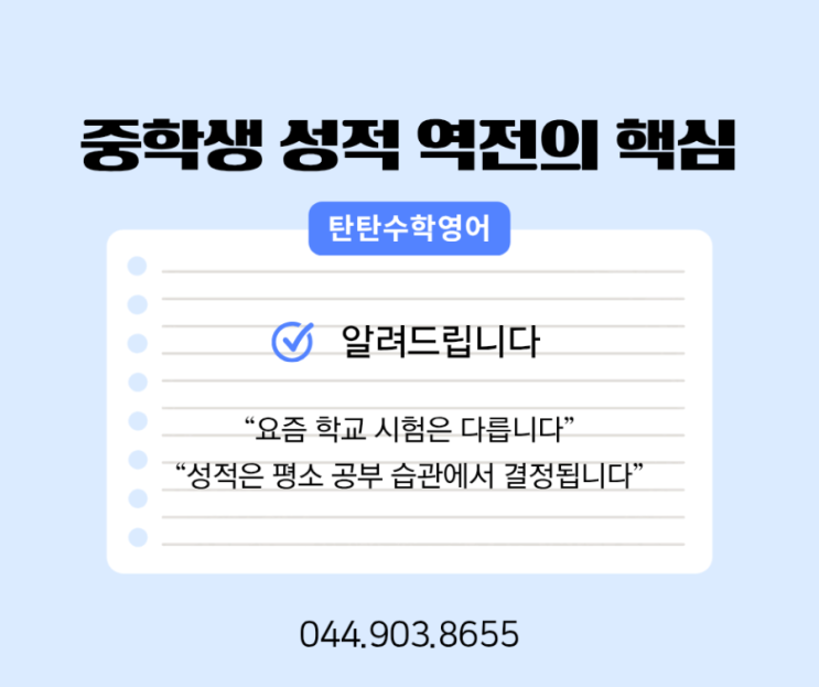 요즘 학교 시험은 다르다! 수행평가 점수까지 잡는 공부 습관 예전에는 시험 기간이 되면 문제집을 많이 풀고 암기하면 성적이 어느 정도 나왔습니다. 하지만 요즘 학교 시험은 분위기가 많이 달라졌습니다. ✔ 서술형 문제 증가 ✔ 수행평가 비중 확대 ✔ 과정 중심 평가 이제는 시험지 점수만으로 성적이 결정되지 않습니다. 특히 중학교에서는 수행평가 점수가 성적을 크게 좌우하는 경우도 많습니다. “평소에 어떻게 준비해야 할까요?” 오늘은 수행평가에서 좋은 결과를 얻기 위해 평소에 준비해야 할 학습 습관을 이야기해 보겠습니다. 답만 맞추는 공부는 이제 부족합니다 요즘 시험의 가장 큰 특징은 ‘왜 그렇게 되는지 설명하는 능력....... <img src="https://blogthumb.pstatic.net/MjAyNjAzMDlfMTI5/MDAxNzczMDEwOTg4NTQy.7zglVctKAZqKXf2uK2YpGE3UwMp5oy3YZ1680cUceWwg.8fKl2hLjS_ndrIKY4EgOH5KFlHLjq0gz72EDoq88rHUg.PNG/900%A3%DF%C6%C4%B6%FB_%B4%DC%BC%F8%C7%D1_%B7%B9%C0%CC%BE%C6%BF%F4_%BE%C8%B3%BB%BB%E7%C7%D7_%C6%E4%C0%CC%BD%BA%BA%CF_%B0%D4%BD%C3%B9%B0%A3%DF20260309%A3%DF080252%A3%DF0000.png?type=s3" />