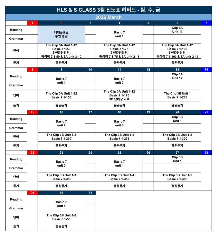 (중원구 금광동 영어학원) 3월 각 반별 진도표 안내드립니다!