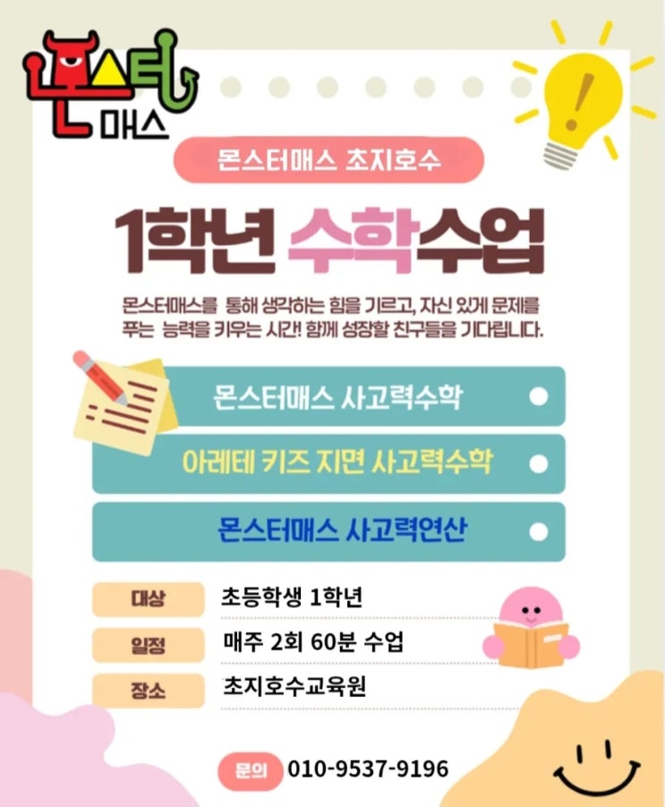 초등학교 입학을 축하합니다! 몬스터매스와 함께 시작하는 첫 배움 설렘 가득한 3월, 아이들이 ‘학생’이라는 이름으로 새로운 출발선에 섰습니다. 초등학교 입학을 진심으로 축하합니다. 입학은 단순히 학교에 가는 것이 아니라 처음으로 ‘배움의 습관’을 만들어가는 아주 중요한 시작입니다. 초등 1학년, 지금 가장 중요한 것은? 이 시기에는 ✔️ 많이 아는 것보다 ✔️ 빨리 푸는 것보다 배우는 힘을 기르는 것이 중요합니다. 끝까지 해보는 힘 스스로 생각하는 습관 틀려도 다시 도전하는 태도 이것이 바로 앞으로의 수학 실력을 만드는 기초가 됩니다. 몬스터매스가 중요하게 생각하는 것 초등 저학년은 ‘공부의 양’이 아니라 ‘....... <img src="https://blogthumb.pstatic.net/MjAyNjAzMDFfMjE3/MDAxNzcyMzYzNjc1NjQw.SJr_jSJ-ujEeo8laHe9ge-oH4KEya6VDa3xXFPFh5cwg.Ixu1YBZqYT4-knh2H7jKUo5MWkCe1MhjBGG1bX6muUEg.JPEG/900%A3%DFScreenshot%A3%DF20260301%A3%DF200742%A3%DFCanva.jpg?type=s3" />