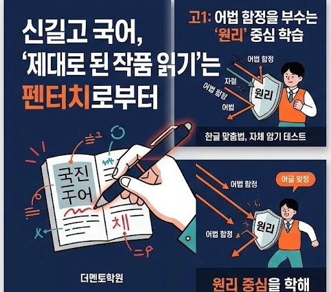안녕하세요. 신길고등학교 국어 내신 전문 더멘토입니다. 중학교 때 국어를 무난하게 했던 아이들도, 고등학교 국어 문제에서 꽤 많이 당황하곤 합니다. 특히. 신길고 1학년 국어는 단순히 지문을 외운다고 해결되지 않습니다. 등급을 가르는 7-8문항의 정교한 어법 함정과 조금반 방심해도 빠지기 쉬운 문학의 자의적 해석때문입니다. 멘토는 어떻게 학습할까요? 1. 펜터치로 완성하는 '제대로 된 작품 읽기' 많은 학생들이 소설에서 인물관계를 놓치거나 정서를 대충 짐작합니다. 멘토에서는 학생이 지문에 인물관계/서술어체크장면구분을 직접 하게하고. 국어 전담 선생님께서 1:1로 피드백합니다. 아이가 무엇을 놓쳤는지. 직접 눈....... <img src="https://blogthumb.pstatic.net/MjAyNjAzMDNfMTgw/MDAxNzcyNDY1Njk3ODc5.6GwJYgQ2bK8pF328Xk11iIIdcfnogufal-9DO3Bz78kg.Kciv7hkk7Xo7KMzD2CKL2qG7G0urvb2pmwFxVwKuQSsg.PNG/image_%287%29.png?type=s3" />