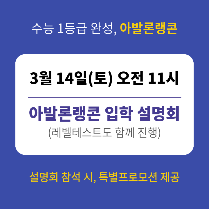 3월이 시작됐는데… 지금 영어학원을 알아보는 건 늦은 걸까요? 봄학기가 시작되면 많은 학부모님들이 이런 고민을 하십니다. 이미 학기가 시작된 시점이라 학원을 옮기거나 새로 시작하는 것이 늦은 건 아닐까 걱정되기 때문입니다. 하지만 실제로는 3월 초가 오히려 중요한 판단 시기이기도 합니다. 학교 수업이 시작되면서 아이의 현재 학습 상태가 조금씩 보이기 시작하고, 어떤 부분을 보완해야 할지 방향도 조금 더 명확해지기 때문입니다. 그래서 아발론랭콘잉글리쉬 구리캠퍼스에서는 3월 14일(토) 입학설명회와 레벨테스트를 함께 진행합니다. 아직 영어학원을 고민 중이라면 한 번 확인해보세요 혹시 이런 고민을 하고 계신가요? 지금....... <img src="https://blogthumb.pstatic.net/MjAyNjAzMDZfMTg5/MDAxNzcyNzk5NzQzODk0.4AffIkZJIHc2v8RmrZR4-2gExJ0LF8xbZaGCz1OU46kg.yZVQ0AsikMMghbf5STP4onR8wRSDJ63jQDbStvpBcH4g.PNG/%BC%B3%B8%ED%C8%B8_%281%29.png?type=s3" />