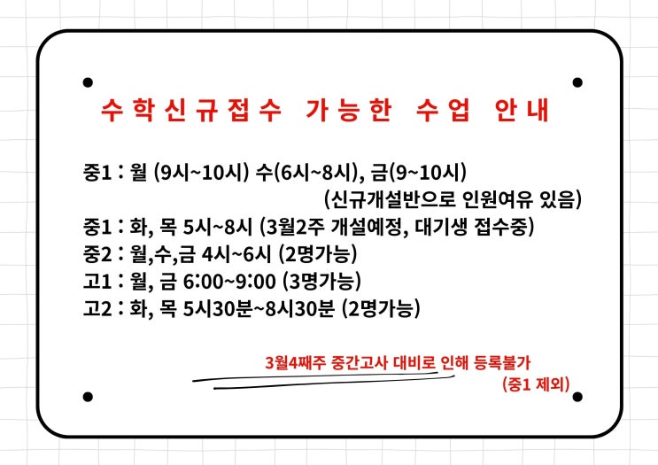 새 학기다 보니 여러 학부모님들께서 신규 가능 문의를 주시는데요 소개 받아 전화를 하셨는데도 시간이 맞지 않을때가 많아서^^ 접수 가능한 시간 부터 알려 드리고 ㅎㅎ [중1] 올 겨울방학끝나기 전 3학년 내용까지 전부 한번은 훓는걸 목표로 합니다. 깊이있게 들어가는건 아닙니다. 말그래도 한바퀴 돌리는겁니다. (장담하건데.. 그 어느 학원, 어느 선생님께 배워도 한번에 수학이 마무리 되는 일은 없습니다. 중간, 기말고사 준비하며 다져 가는 진도랑 선행으로 돌리는 거랑은 아무래도 완성도의 차이가 있습니다. 언젠가 전교1-2등 하는 학생이 저희 학원에 레벨테스트를 보러 온적이 있습니다. 내신 공부만 하는 학생 아니고 선행도 아....... <img src="https://blogthumb.pstatic.net/MjAyNjAzMDJfMjg3/MDAxNzcyNDQ1NjM3NDU5.teq8BLykddxrHjWcJji4RVEsnDgUpwMpjdUoCCbXVG4g.Hbwo3oDFjqM0inF7jAinuJQV_A79hqgUJHuOlDzj2hUg.JPEG/open.jpg?type=s3" />