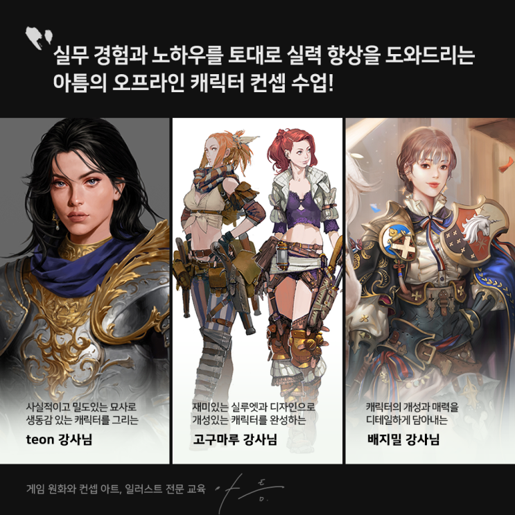 안녕하세요 여러분:) 이달의 아틈 수업 소식입니다!이번 시간에는 오프라인으로 들을 수 있는 캐릭터 컨셉 수업을 위주로 준비해 보았는데요.수업에서는 강사님들의 실무 경험을 바탕으로 컨셉 아트에 필요한 지식과 노하우를 공유하며, 학생 개개인의 목표와 방향에 맞춰 실력을 높일 수 있도록 도와드리고 있습니다. 아래에 간략한 소개와 함께, 그림 배너를 누르면 해당 강사님들의 작품들과 더 자세한 수업 커리큘럼을 확인할 수 있는 페이지로 이동하니 참고 부탁드려요! 먼저 태온[teon] 강사님의 캐릭터 컨셉 반입니다. 태온 님은 사실적인 표현과 밀도 있는 묘사로 실존하는 듯한 캐릭터를 그리는 아티스트인데요. 수업에서는 실사 기반....... <img src="https://blogthumb.pstatic.net/MjAyNjAzMTJfMTg5/MDAxNzczMjk0NDI2MjE2.KXR0hAuDGsHrG3TIW2qws7GZ30sFsryIk6-yd2EyzdAg.Do6dogJbBLIwYY3sE8k9olWgE1QHeygisVFBPImG6Qwg.PNG/arteum_sns%C8%AB%BA%B8_9%C2%F7.png?type=s3" />