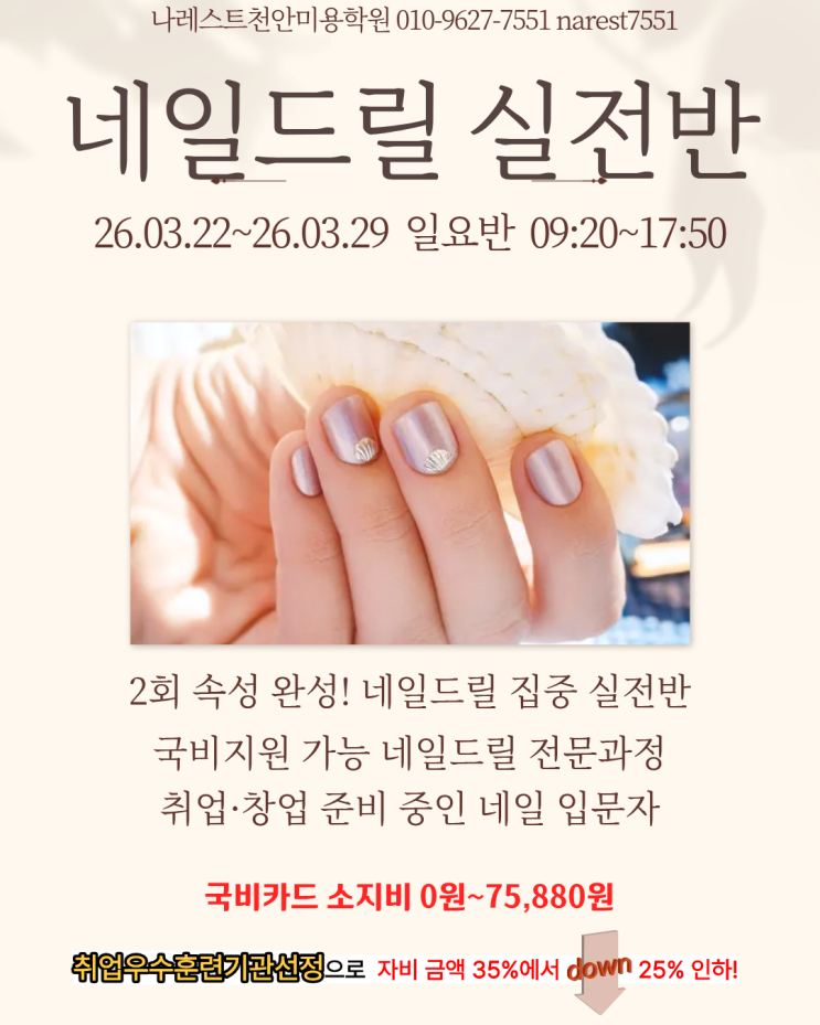 안녕하세요 나레스트천안미용학원 입니다. 네일드릴 신전반 26.03.22~26.03.29 일요반(주2회) 09:20~17:50 아산네일 드릴 실전반, 단 2회 수업으로 실력 업그레이드! 네일아트를 시작하거나 네일샵 취업, 창업을 준비하는 분들이라면 한 번쯤 고민하게 되는 것이 바로 네일 드릴 실력입니다. 특히 아산네일 시장에서도 드릴 기술은 이제 선택이 아니라 필수라고 할 수 있습니다. 요즘 아산네일 샵에서는 빠르고 정교한 시술을 위해 드릴 사용 능력을 중요하게 보기 때문에 제대로 된 교육을 받는 것이 중요합니다. 그래서 오늘은 아산네일 교육을 찾는 분들에게 꼭 소개하고 싶은 네일드릴 실전반을 안내해드리려고 합니다. 단기간에 실력을 높이....... <img src="https://blogthumb.pstatic.net/MjAyNjAzMTVfNyAg/MDAxNzczNTYyMjIxODYy.EVM-kzDtE0yZn-RiqoHUdB9C88tVZMY0CFp52x7hVA8g.9i9KOLDZOgguWOaN33js6PO_6wStEUEwYmbGIWo_bGkg.PNG/%C1%A6%B8%F1%C0%BB_%C0%D4%B7%C2%C7%D8%C1%D6%BC%BC%BF%E4._%283%29.png?type=s3" />