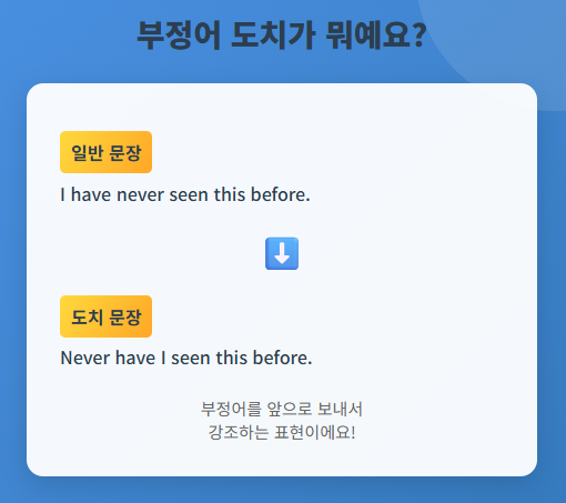 안녕하세요! 영어회화를 공부하다 보면 "Never have I seen..."이나 "Rarely does he..."같은 표현을 들어보셨을 거예요. 처음에는 "어? 왜 순서가 이상하지?"라고 생각하셨을 텐데요, 오늘은 이 신비로운 부정어 도치 문법을 여러분이 쉽게 이해하고 실전에서 바로 사용할 수 있도록 상세히 알려드릴게요! 부정어 도치가 뭐길래? https://www.youtube.com/shorts/UJ3-Aa72ID0 부정어 도치? 문장에서 부정의 의미를 가진 단어나 표현이 문장 앞에 올 때, 그 뒤의 주어와 동사의 순서가 바뀌는 문법 규칙 쉽게 말해, "강조하고 싶을 때 쓰는 특별한 어순"이라고 생각하시면 됩니다! . . . 일반 문장: I h....... <img src="https://blogthumb.pstatic.net/MjAyNTEyMTJfMjEx/MDAxNzY1NTI5ODI3Nzk3.U43JyDUGFfy0vsKLsVYj644Jo1aHuSMrDZz6v-rpsNYg.lxxtrOqCG5VfT2OLwaYoUBqaQnYMMN2LRUr--DL2VGEg.PNG/image.png?type=s3" />