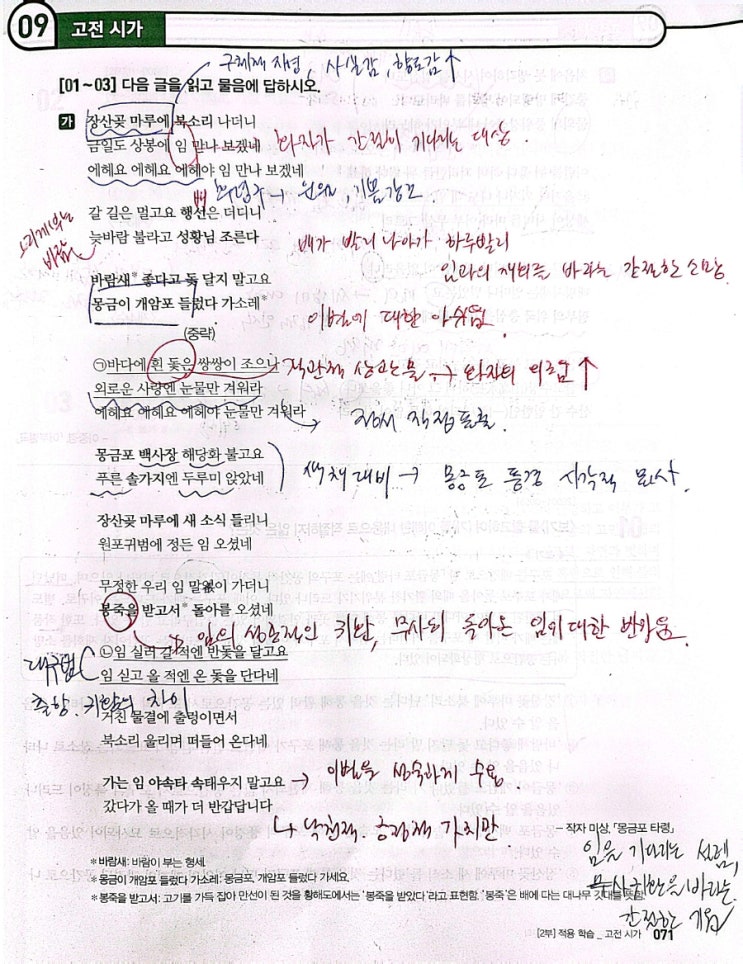 고전 시가는 현대어 풀이만 한다고 끝나는 것이 아닙니다. 작품 속에 담긴 화자의 정서, 공간의 의미, 그리고 복잡한 수사법을 '내 것'으로 만들어야 합니다. 1. 작자 미상, <몽금포 타령> – 포구의 역동성과 재회의 소망 사진 속 교재 필기를 보시면 아시겠지만, <몽금포 타령>은 단순히 바다 노래가 아닙니다. 공간의 중의성: 포구는 배가 떠나는 '이별의 공간'인 동시에, 배가 돌아오는 '재회의 공간'입니다. 감각적 묘사: '해당화', '푸른 솔가지' 등 색채 대비를 통해 몽금포의 풍경을 시각적으로 형상화한 부분을 집중적으로 파헤쳤습니다. 낙천적 태도: "임 실러 갈....... <img src="https://blogthumb.pstatic.net/MjAyNjAzMTFfMTQg/MDAxNzczMTkxOTAwNTQ4.q8GfoOjUpR51oeI6sUDF77BbIM_hIgQzpbNTCBXKq7og.ZCASfmMsq1hPckIiI1p7oon1-4dDSfXD6qiO8ghabUkg.JPEG/900%A3%DF1773191857804.jpg?type=s3" />