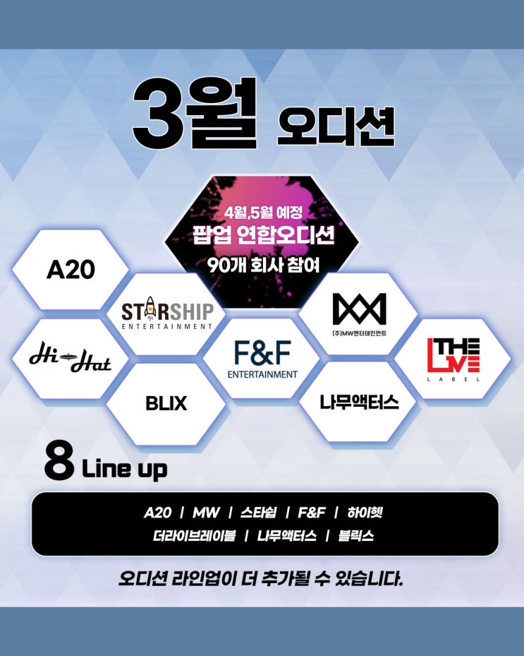 3월 내방오디션 | A20, MW, 스타쉽, F&F, 하이헷, 더라이브레이블 등 8개 기획사 참여