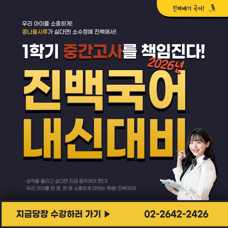 진백국어 중간고사 대비 개강! 고등부 국어 내신 3/14(토) 개강! 2025년 내신 성적 상승 다수! 2025학번, 2026학번 2년 연속 서울대, 의대 합격! 동급 최고 입시 실적! 내신도, 수능도 단연코 진백국어 학원에서! [고1] 강서고1: 일1시~4시 대일고1: 수7시~10시 양정고1: 일4시~7시 영일고1: 토1시~4시 한가람고1: 월7시~10시 [고2] 강서고2: 일10시~1시 대일고2: 토4시~7시 양정고2: 토7시~10시 한가람고2: 토10시~1시 [고3 수능 집중반] 일7~10시 열심히 준비해서 꼭 좋은 결과 내도록 하겠습니다. 유튜브 수업 영상: https://youtu.be/dtTH3htrU-I?si=DYsAnLC6JKA8Yr2J 인스타: https://www.instagram.com/jinbaek2426 상담: 02-2642-242....... <img src="https://blogthumb.pstatic.net/MjAyNjAyMjhfMjQ1/MDAxNzcyMjY3NDg1MjQ3.kD7o3zlFl8dn4Gep5EH3FaxoVpZbGqjIch9cDDx0Z5cg.fT_kLVRb35t_Rc0GWLBl-cNCe1NgR-eDMMusRjazcvUg.JPEG/%B8%F1%B5%BF%B1%B9%BE%EE%C7%D0%BF%F8_%C1%F8%B9%E9%B1%B9%BE%EE_%C1%DF%B0%A3%B0%ED%BB%E7_%B3%BB%BD%C5%B4%EB%BA%F1_%BD%C3%B0%A3%C7%A5_%281%29.jpg?type=s3" />