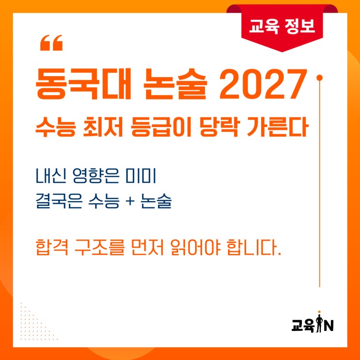 동국대 논술 2027 분석, 수능 최저 등급 충족이 합격 가른다 동국대 논술 수능 최저 영향력과 계열별 대비 전략 총정리 겉으로 보면 논술 70%, 학생부 30%입니다. 하지만 구조를 뜯어보면 전혀 다르게 읽혀야 합니다. 이번에 공개된 가이드 내용을 바탕으로 보면 동국대 논술 2027은 내신 경쟁 전형이 아니라 사실상 ‘수능 통과형 논술’에 가깝습니다. 학부모님 입장에서 가장 먼저 정리해야 할 부분은 바로 여기입니다. 내신보다 중요한 것은 수능 최저 동국대 논술 수능 최저는 이번 전형의 실질적 1차 필터입니다. 학생부 반영 비율은 존재하지만, 등급 간 점수 차가 매우 작습니다. 상위 등급과 중위 등급 사이의 격차가 미미하기 때문에, ....... <img src="https://blogthumb.pstatic.net/MjAyNjAyMjVfMjcg/MDAxNzcyMDI4MTE5NTkx.Hngis6bLHnpmjRd2j0H4NEIm1ZY6T57EdEmMrfUp2TIg.k_y9grk_JE07_S1ein2CW1ZkVhMZ2uIihDbEXTQH_hgg.JPEG/001.jpg?type=s3" />