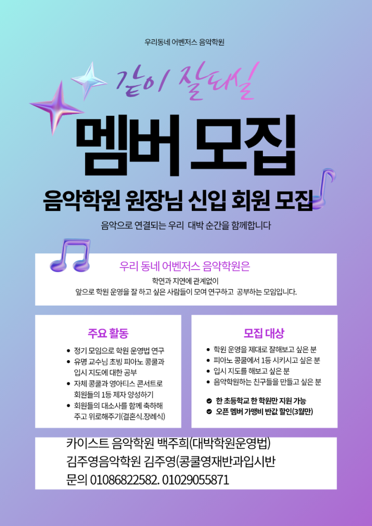어벤저스 음악학원 운영 연구모임에서 신입 회원을 모집합니다~ 지연.학연 관계없이 함께 공부하고 성장하실 원장님들 모십니다~ 학원 운영의 비밀 저서를 내신 백주희 원장님과 대박학웟 사례로 힐림콘서트에서 강연을 했던 닉네임 날마다 감사 김주영 원장이 함께 만든 모임입니다^^ 함께 연구하고 고민하면서 성장하겠습니다~ 음악학원을 운영하는 원장님들이 모여 실제 운영 경험과 노하우를 나누고 함께 성장하는 프리미엄 연구모임입니다. 연구모임에서는 ✔ 음악학원 운영 전략 ✔ 콩쿨 준비 및 학생 관리 시스템 ✔ 학부모 상담 노하우 ✔ 실제 성공 사례 공유 이론이 아닌 현장에서 바로 적용할 수 있는 실전....... <img src="https://blogthumb.pstatic.net/MjAyNjAzMDZfMTgw/MDAxNzcyNzU2OTkxMDky.7-WScI5dikAQ3PwaZZv0vQCj2D5XhQFRgXmJXe0QL2Mg.HEW4dY7lhLXIynw991c2M0hxt_bZI3Ea1kWT3mr1HZsg.PNG/900%A3%DF%C7%CF%B4%C3%BB%F6_%BA%B8%B6%F3%BB%F6_%B1%D7%B6%F3%B5%A5%C0%CC%BC%C7_%B9%EA%B5%E5_%B5%BF%BE%C6%B8%AE_%C8%B8%BF%F8_%B8%F0%C1%FD_%C0%FC%B4%DC%C1%F6%A3%DF20260306%A3%DF091107%A3%DF0000.png?type=s3" />