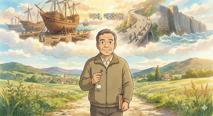 안녕하세요. 오늘도 하루를 정성껏 가꾸어 나가시는 이웃님들께 따뜻한 안부를 전합니다. 1,400여 명의 이웃분과 매일 소소한 일상을 나누다 보니, 이제는 블로그가 단순한 기록의 공간을 넘어 서로의 온기를 나누는 작은 사랑방처럼 느껴지네요. 특히 저와 비슷한 시대를 걸어오며 삶의 무게를 견디고 계실 40-50대 이웃님들을 생각하며, 오늘은 조금 더 깊고 차분한 이야기를 나누어보려 합니다. 오늘 제가 산책길에 만난 문장 하나가 가슴에 큰 파동을 일으켰거든요. 바로 고(故) 정주영 회장님의 그 유명한 한마디, **"이봐, 해봤어?"**입니다. 01. 단순함이 일궈낸 기적, 그 단단한 힘에 대하여 우리는 흔히 기적이라고 하면 하늘....... <img src="https://blogthumb.pstatic.net/MjAyNjAyMDNfMTgy/MDAxNzcwMTI1NzE0NDcy.cw_3nxbwAclhcLu8fIM44Uo2VceZjOad8m3vlPddQ9Eg.GlwbdxXCYezVM6CX3PnkwWnLeZ9IWioAIPuJ9BaFvAUg.PNG/Gemini_Generated_Image_9e3wzx9e3wzx9e3w.png?type=s3" />