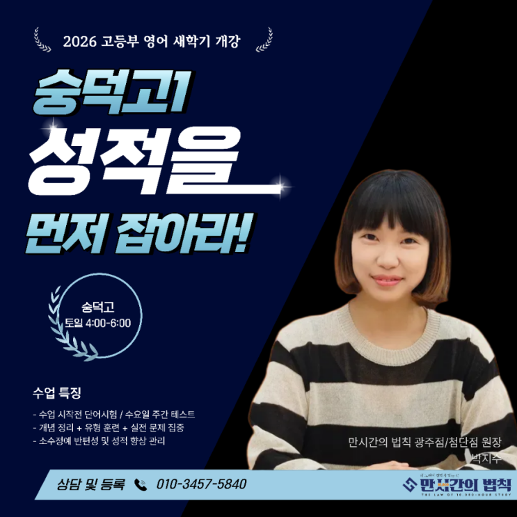 원장직강으로 준비하는 내신영어 만시간의법칙 첨단학원 내신 대비 시스템 안녕하세요. 만시간의법칙 첨단학원입니다 새 학기가 시작되면 학생들과 학부모님들이 가장 많이 하는 질문이 있습니다. “고등 내신 영어는 어떻게 준비해야 하나요?” 고등학교 내신 영어는 단순히 단어를 외우거나 문제를 많이 푸는 것만으로 좋은 결과가 나오기 어렵습니다. 학교 시험은 출제 포인트를 정확히 이해하고, 충분한 연습을 통해 대비하는 것이 가장 중요합니다. 특히 숭덕고 영어 내신 시험은 매 시험 난이도의 차이가 있기 때문에 더욱이 전략적으로 준비해야합니다. 그래서 만시간의법칙 첨단학원에서는 원장 직강을 중심으로 한 체계적인 내신 대....... <img src="https://blogthumb.pstatic.net/MjAyNjAzMDlfNDQg/MDAxNzczMDM4NzY1MDI5.4SGjIJi6RpPAOi8kWbAO7Ub-3tfp02fBlGfokF72sPIg.s9idKqz8Fu7bkSBSP3v0Fgp4k_E_VJr2M7MZPijngIMg.PNG/900%A3%DF1772270318234.png?type=s3" />