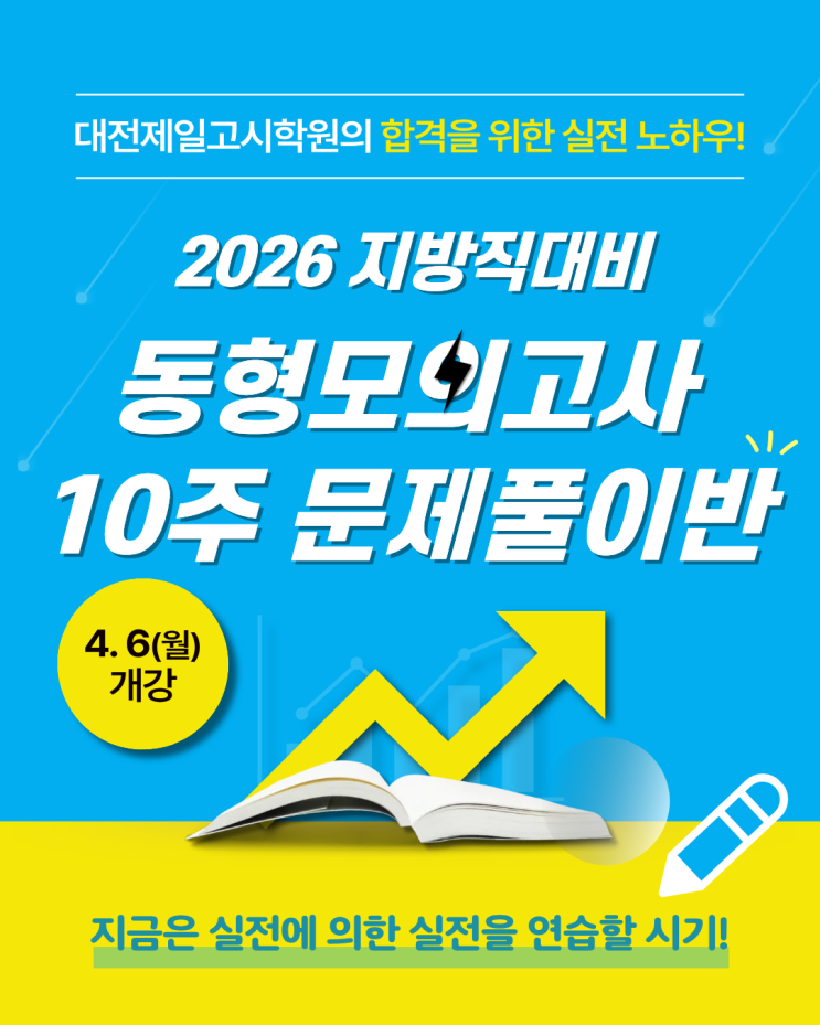 안녕하세요 대전제일고시학원입니다 :> 오늘은 2026 지방직 공무원 시험을 준비하는 수험생분들을 위해 대전제일고시학원에서 준비한 2026 지방직 대비 동형모의고사 10주 문제풀이반을 소개하겠습니다! *4월 6일(월) 첫 개강! -현재 접수중- 2025년 변경된 시험출제 경향에 맞게 엄선된 문제로 시작되는 전범위 동형모의고사 문제풀이반! 시험장까지 반드시 알고 가야하는 핵심이론들과 새로운 문제 스타일로 다가오는 2026 지방직 시험을 완벽 대비하시기 바랍니다 고민할 시기에, 다른 수험생들은 이미 시작하고 있습니다. 공무원이라는 직업을 갖기 위한 도전을 하고자 한다면 고민할 시간도 아깝지 않을까요? 지방직대비 모의고사반(4H)은....... <img src="https://blogthumb.pstatic.net/MjAyNjAzMTlfMTQ4/MDAxNzczODg1NTQ0MDUy.yX8RxKCHmRUO__WMm1TvkiMV6rKwsvwF9kaEuNiK3bog.VWDWHfBhFtOD8lUIR_BA_3gXmAeNPJemLGyHVm9D7pEg.PNG/1.png?type=s3" />