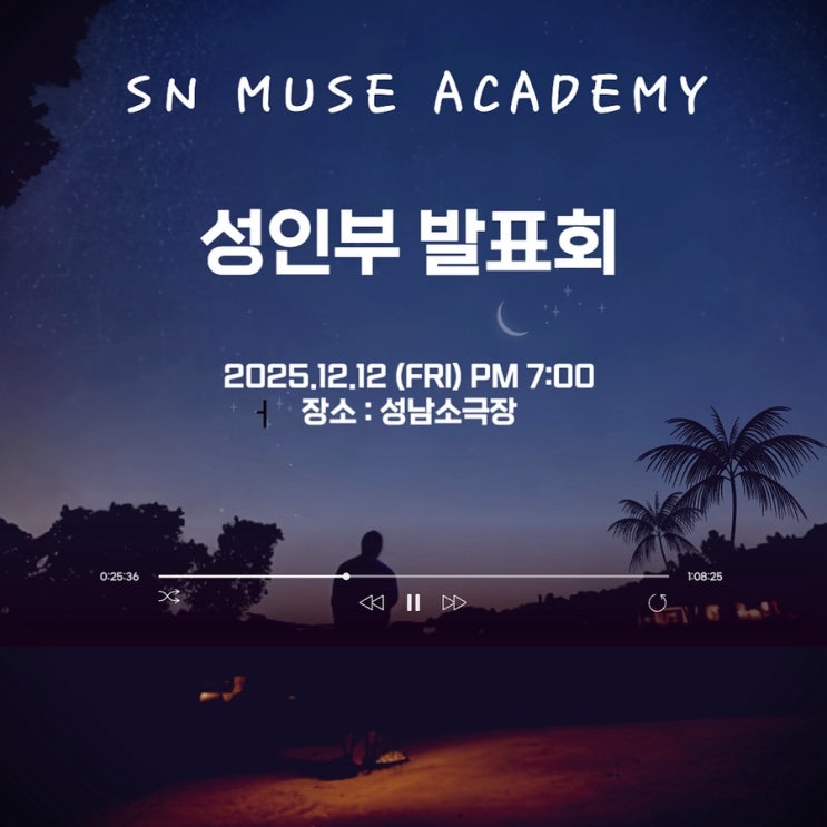 안녕하세요. 성남뮤즈 실용음악학원장 이진아입니다 연말에 성남뮤즈 성인부 수강생분들과 무대를 준비하고있어요. 긴장감 없이 굴러가는 연습 말고 실전을 좀 해보자 하는 마음으로 준비하고 있습니다 많은 관심 부탁드려요 2025년 한 해 함께할 수 있어서 감사했습니다. 덕분에 더 의미 있는 시간이 되었어요. 한 해 잘 마무리하시고, 새해에는 건강과 행복이 늘 함께하시길 바랍니다. 내년에도 잘 부탁드립니다 <img src="https://blogthumb.pstatic.net/MjAyNTExMjVfMjYz/MDAxNzY0MDM2NzkxOTky.jvVZeyByzaTs2EjmJ8oLnpWXgzzyhMIWaY4d9n6zrYAg.-ig91kqn8GJ2mDmnthfl9aQEdxFmtCCX6W4McaneVXMg.JPEG/402F7FA9%A3%ADFD80%A3%AD41CD%A3%AD90A4%A3%ADEE912A04B26D.jpg?type=s3" />