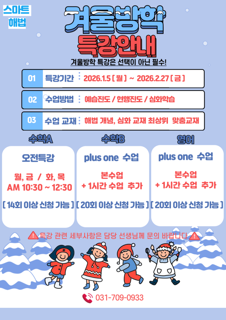 스마트 해법 분당 이매점 에듀맥스 학원 (스마트 해법 영어, 스마트 해법 수학) 입니다 이 번 겨울 방학 특강 안내드립니다 겨울 방학 2달 동안 부족한 단원 복습과 새 학기 예습을 잘 준비하는 보람된 겨울방학을 보냈으면 합니다 상담문의 709-0933 #돌마초 수학, 해법영어 #하탑초 해법수학학원 #하탑초 해법 영어 학원 #야탑동 수학, 영어학원 #이매동 수학 영어 학원 #HME 준비학원 #꼼꼼한 개념 설명 학원 #믿고 보내는 초등, 중등학원 <img src="https://blogthumb.pstatic.net/MjAyNTEyMDZfMjYw/MDAxNzY0OTg5NTA4NTY1.ztvY_vwoWtf2MJRgZBhhCmwoqk5xV_xhzDI7e8IQAakg.uRikIOlCWWqDv0UXPjiNkWIJtf_BuaxBDDJ350yNRj4g.PNG/%C1%A6%B8%F1%C0%BB%A3%AD%C0%D4%B7%C2%C7%D8%C1%D6%BC%BC%BF%E4%A3%DF%A3%AD001%A3%A83%A3%A9.png?type=s3" />