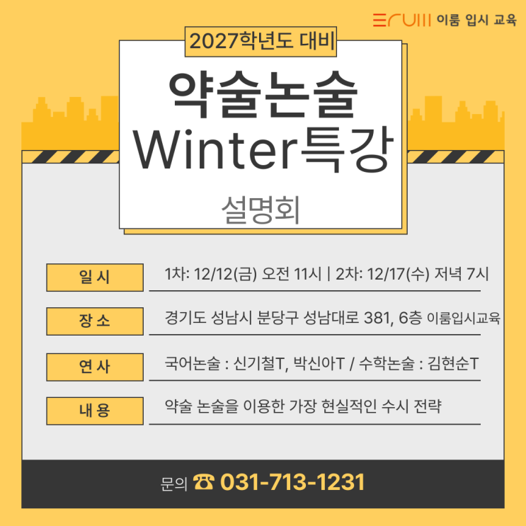 『분당에는 이룸이 있다』 프리미엄 상위 1% 입시 브랜드 이룸 입시 교육입니다 ■ 2027학년도 대비 약술형 논술 겨울방학 특강 대비 설명회 ■ 장소 : 이룸입시교육 2관 (경기도 성남시 분당구 성남대로 381, 6층(정자동,폴라리스1빌딩)) ■ 설명회 연사 : 국어논술 → 박신아T, 신기철T / 수학논술 → 김현순T ■ 설명회 내용 ※ 약술 논술을 이용한 가장 현실적인 수시전략 ① 2027학년도 수시논술 & 약술형 논술 전형별 특징 ② 국민대부터 ~ 수원대까지, 약술형 논술 대학 분석 ③ 약술형 논술 합격 전략 ④ 약술형 논술 + 수능 병행 공부법과 대비 전략 :: 약술형 논술에서 합격한다는 약술형 쓰기법 안내 :: 수학 논술 수특 → 씨에스....... <img src="https://blogthumb.pstatic.net/MjAyNTEyMDZfOTUg/MDAxNzY0OTgyNjMxMDIw.XQRNYgHlFcFTxgRy6_d3JwmfnAed6U7WZQWKNE5pQ8Mg.slVQk8YbHc4ppWStoXwKBsk061AsiomyQLw1eR3r2PEg.PNG/2027%C7%D0%B3%E2%B5%B5%B4%EB%BA%F1%B0%DC%BF%EF%B9%E6%C7%D0%BE%E0%BC%FA%B3%ED%BC%FA%C6%AF%B0%AD%BC%B3%B8%ED%C8%B88%C1%D6%BF%CF%BC%BA%BA%D0%B4%E7%BE%E0%BC%FA%C7%FC%B3%ED%BC%FA%C0%FC%B9%AE%C7%D0%BF%F8%C0%CC%B7%EB%BA%D0%B4%E7%B0%A1%C3%B5%B4%EB%B3%ED%BC%FA%C0%FC%B9%AE%C7%D0%BF%F8%C0%CC%B7%EB%BA%D0%B4%E7%C0%CE%B9%AE%B3%ED%BC%FA%BC%F6%B8%AE%B3%ED%BC%FA%C0%FC%B9%AE%C7%D0%BF%F8%BC%F6%B4%C9%B1%B9%BE%EE%C7%D0%BF%F8%BC%F6%B4%C9%BC%F6%C7%D0.png?type=s3" />