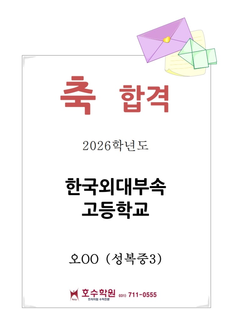 2026학년도 자사고 합격자 한국외대부속 외국어고등학교 오OO (성복중) 합격을 축하드립니다. !! <img src="https://blogthumb.pstatic.net/MjAyNjAzMDVfMTQx/MDAxNzcyNzAwMTUyNDkw.mTaqwgBuGOz-J37XTnaVGPctiq2PBi933gmMYGLePMUg.-fyYleJ0KKLzJ01B4Hrc_Fz-xb933Vb2S87Lq1_RVPMg.JPEG/%C0%DA%BB%E7%B0%ED%C7%D5%B0%DD%C0%DA_%C3%E0%C7%CF%B0%F8%B0%ED-%BF%C0OO_1.jpg?type=s3" />