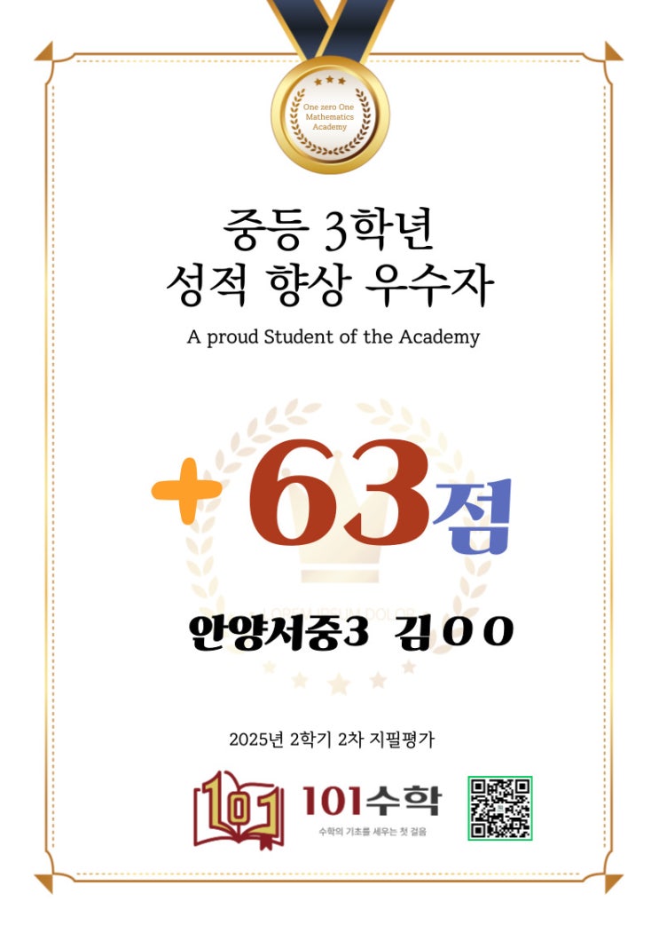 한 달 전, 우리 학원에 들어온 중3 학생은 수학에 대한 자신감도, 성적도 많이 떨어진 상태였습니다. 문제를 보면 손부터 멈추고, 계산 실수는 반복되고 시험을 봐도 "모르겠다'는 말이 먼저 나오던 아이였습니다. 그리고 한 달, 이번 학교 시험에서 무려 63점 상승이라는 결과를 만들어 냈습니다. 달라진건 점수만이 아니었습니다. 이제 이 학생은 "수학이 어렵다"가 아니라 "한 번 해볼 만하다"라고 말합니다. 일공일 수학이 만든건 성적 뿐 아니라 아이의 가능성입니다. 이 학생처럼, "기초를 다시 세우는 것만으로도 점수는 충분히 오를 수 있다"는 것을 우리는 매번 확인합니다. 그래서 일공일 수....... <img src="https://blogthumb.pstatic.net/MjAyNTExMjlfMTcz/MDAxNzY0NDAzNjg3MDMx.m7T239eYXapLS5jfPq4o-Lgho7asm9U11OO3vO8RiZgg.xTPWbs75J1pAY593iu9oskLaU0c2JAzXzOIxhApzRL8g.JPEG/%C1%DF3.jpg?type=s3" />