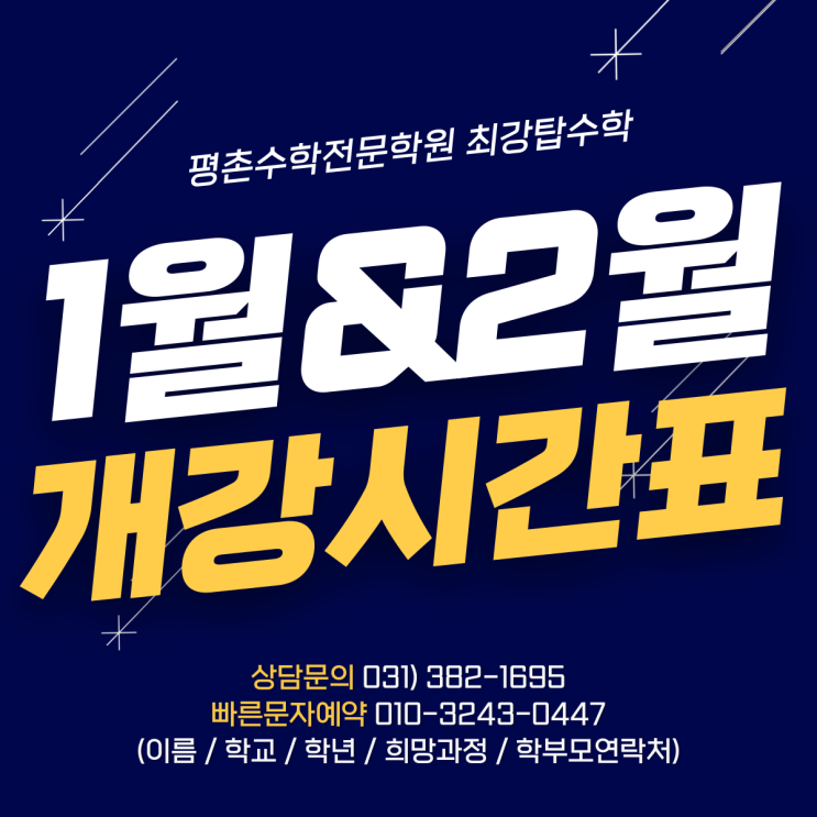 최강은 다릅니다 최강탑수학 고등부 1월&2월 개강안내 예비고1 / 예비고2 / 예비고3 최강은 다릅니다 고등 정규과정 ■ 정원 최대 9명 ■ 수업 구성 : 칠판강의 + 1:1 밀착지도 (1:1 밀착지도 수업 내용 : 주간평가 / 부교재 문제풀이 / 오답노트 정리 / 질의응답) 최강은 다릅니다 고등 단과 ■ 수업 과목 : 미적분 / 확통 / 기하 ■ 수업 구성 : 칠판강의 (판서수업) 최강은 다릅니다 최강탑수학 중등부 1월&2월 개강안내 예비중1 / 예비중2 / 예비중3 고등수학을 잘하기 위한 중등수학 중등 정규과정 ■ 정원 최대 8명 ■ 수업 구성 : 칠판강의 + 1:1 밀착지도 (1:1 밀착지도 수업 내용 : 주간평가 / 부교재 문제풀이 / 오답노트 정리....... <img src="https://blogthumb.pstatic.net/MjAyNTEyMTJfNjIg/MDAxNzY1NTMzNDMxMjIw.1tMBMILUiPMlwYIyBqjl3A2i_llx90_ZlFVbw_UkrlEg.COn9iNzgT5VxuplTWzqy8Qlg0ONd4eQAO5cJYlmscvkg.PNG/001.png?type=s3" />
