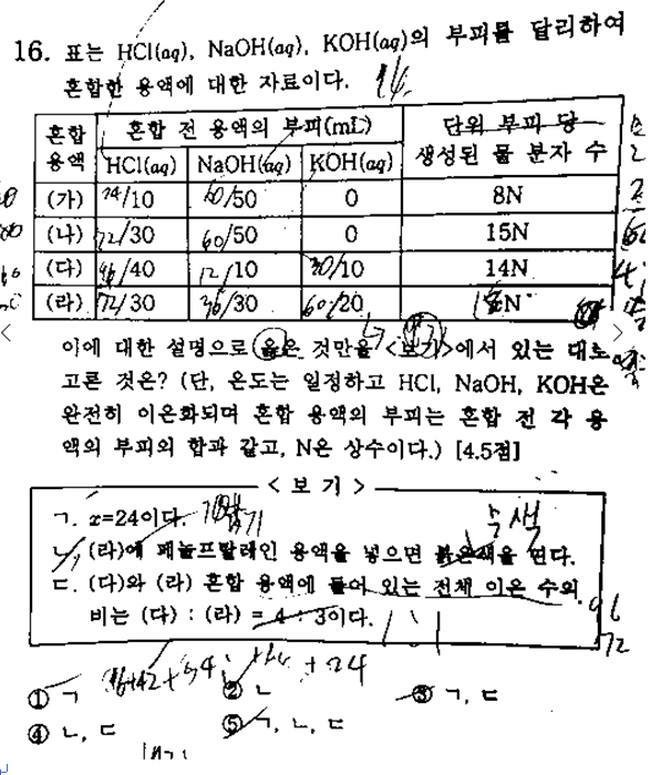 방금전 시험이 끝난 학생이 사진으로 보내왔다. 1가 산과 1가염기 2종류의 저난이도 중화반응 문항이다. 가볍게 풀어봐도 ㄴ만 옳은 진술이니 2번이 정답이다. 그런데 시험 종료 5분을 남기고 담당 선생님이 오셔서 ㄴ선택지의 붉은색을 무색으로 수정하라고 했다면서 학생이 문의를 했다. 그렇게 변경하게 되면 선택지에 옳은 진술이 단 1개도 없게 된다... ------------------------------------------------------------------------------------------------------------ ㄱ. 선택지에 x=24가 제시된 (실제x=18이 나옴) 이유를 추론해 보면, 출제한 선생님이 (다)의 부피를 50mL, (라)의 부피를 60mL로 ... 즉 KOH의 부피를 못보고....... <img src="https://blogthumb.pstatic.net/MjAyNTEyMDFfMTM2/MDAxNzY0NTYyNzc1MTYx.5s_qWkOiNmJ3w_YEynywaKaSbR_X1sDJUg5AvBRBW1og.xstQxT_TWKrVNgka_mROzOZ0Bn61KL3hj1me7QlHVoEg.PNG/image.png?type=s3" />