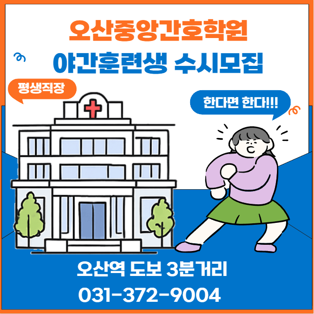 안녕하세요 오산중앙간호학원입니다. 꽃샘추위가 대단하네요 ㅜㅜ 한 겨울 추위보다 더 추운 것 같아요 모두 감기 조심하세요~ 저희 오산중앙간호학원은 이번주에 주간반과 야간반이 동시에 개강하면서 새내기 훈련생분들을 맞이 하느라 정말 분주한 한주를 보냈습니다 ^^ 많은 분들께서 관심 갖어 주시고 문의 해주셔서 정원을 거의 꽉 채운 훈련생분들이 모집됐습니다 감사합니다^^ 이번 주간반은 정원이 다 차더라도 5월에 속성반이 개강하기 때문에 27년 3월 국가고시를 바라보시는 분들은 아직 기회가 있습니다. 하지만 야간반의 경우는 이번에 개강하면 다음 개강이 미정이라 서둘러 주셔야 할것 같아요 야간 국비는 3월18일까지 등록 가능....... <img src="https://blogthumb.pstatic.net/MjAyNjAzMDZfMjg3/MDAxNzcyNzczNTEyODk0.j5U-YK9Mt7MO7y5kbYOnzI9jKX0PUlk3HKLBCoMdVhYg.fV2LlLLSfaz0cGv8DdSBQTX3ikhQHed0uOiCX6hGCLgg.PNG/image.png?type=s3" />