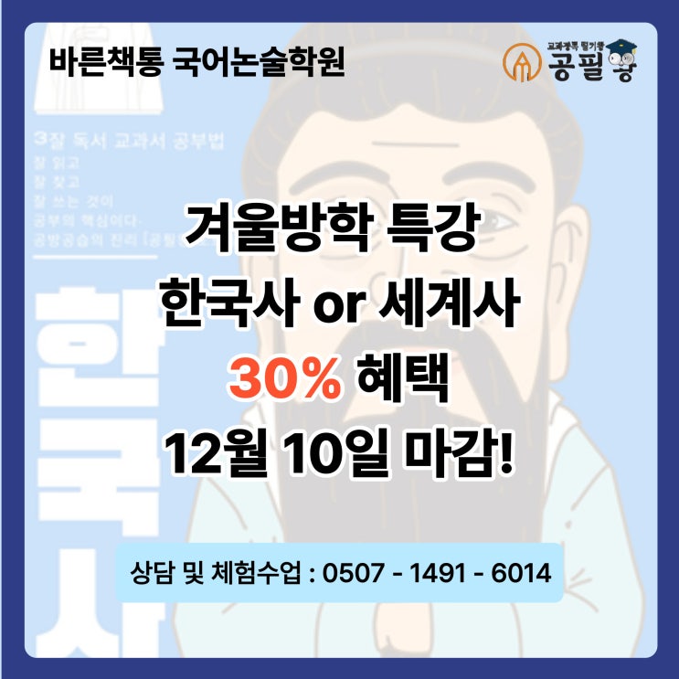 [배곧 역사공부 고민 끝!] 공필왕 겨울방학 흐름특강 오픈특강 오픈 배곧 공필왕 겨울방학 특강 1월 12일 개강! 선착순 10명 30% 할인 인원 충족시 자동 마감 일정 : 1월 12일(월) - 29(목) 2월 2일(월) - 26(목) 시간 : 오전 10시 - 12시 과목 : 한국사, 세계사 중 선택 구성 : 모든 단원 1회독 교과서 기반 필기 정리 상담 및 신청 : 0507-1491-6014 * 설날 연휴 셋째주는 수업이 없습니다. 편하게 연락주시면 아이에게 맞춰 자세하게 안내 도와드릴게요! 역사 공부 때문에 고민하는 학부모님들이 많습니다. 아이들은 초등 고학년부터 한국사 개념이 본격적으로 등장하고, 중학생이 되면 세계사까지 한 번에 들어오면....... <img src="https://blogthumb.pstatic.net/MjAyNTExMjVfMTMy/MDAxNzY0MDM2MzM1Nzc0.WbEiV1hRD6ZK5Niaw9ZNnQjCWTHYWETmPwgudzxhylYg.ShqXPjVbAhdp4uK3iDxlT14hGKXXC9ZMyhzpy8ezZMUg.JPEG/%C1%A6%B8%F1%C0%BB_%C0%D4%B7%C2%C7%D8%C1%D6%BC%BC%BF%E4._%285%29.jpg?type=s3" />