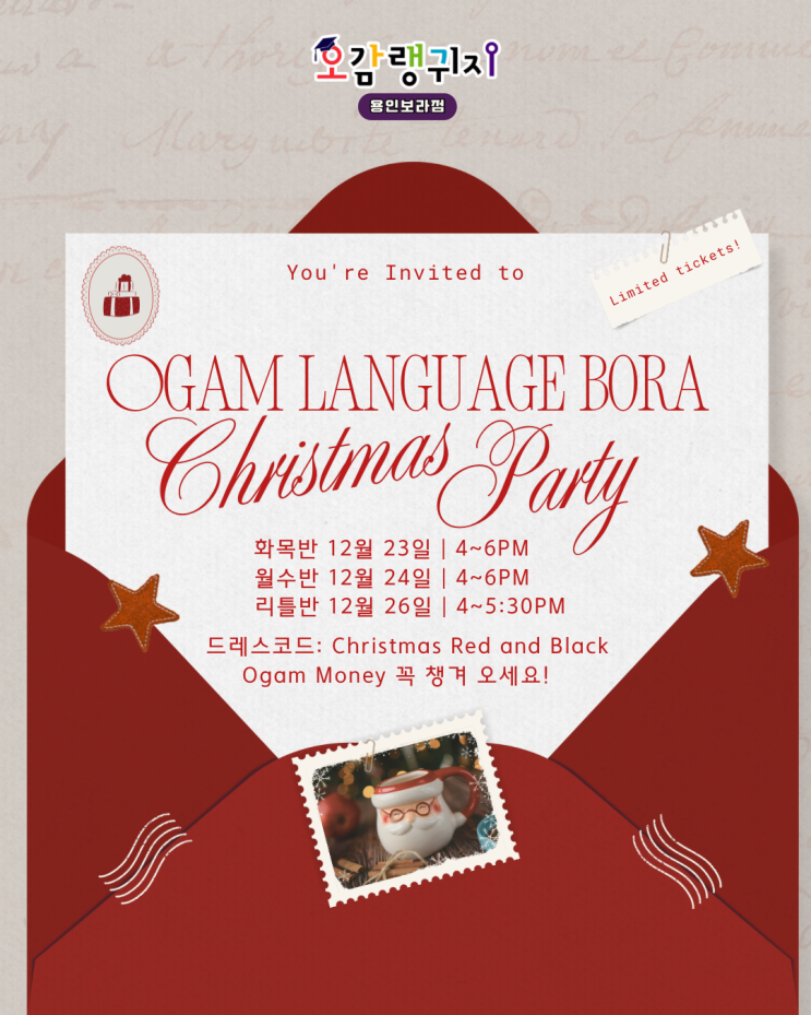 <2025년 크리스마스파티 일정 공개> ✨ 드디어! 기다리고 기다리던 오감랭귀지 용인보라점 크리스마스 파티 ✨ 아이들이 계속 “Teacher 크리스마스 파티 언제 해요?” 하던 바로 그 파티! 올해도 우리만의 따뜻하고 특별한 크리스마스가 찾아왔어요 ❤️ 일정 • 화목반: 12월 23일 (화) | 5:00~6:30PM • 월수반: 12월 24일 (수) | 5:00~6:30PM • 리틀반: 12월 26일 (금) | 4:40~6:00PM Dress Code Christmas Red & Black ❤️ 크리스마스 느낌 물씬 나게 꾸미고 오기! Ogam Money 꼭 챙겨오기! 오랜만에 오감마켓 열립니다! 친구 초대도 가능해요! 함께 오고 싶은 친구가 있다면 초대해....... <img src="https://blogthumb.pstatic.net/MjAyNTEyMDlfMjY4/MDAxNzY1MjcyMzU4OTU1.K7pYUGQiLWwSemFCA54S6qPVVg8J49kR_TSld-Kd4vMg.JT37ivVqYhoVg4lyPjOh8-1JRa-FNZIMT7rXd-XQWR0g.PNG/KakaoTalk_20251125_194209895.png?type=s3" />