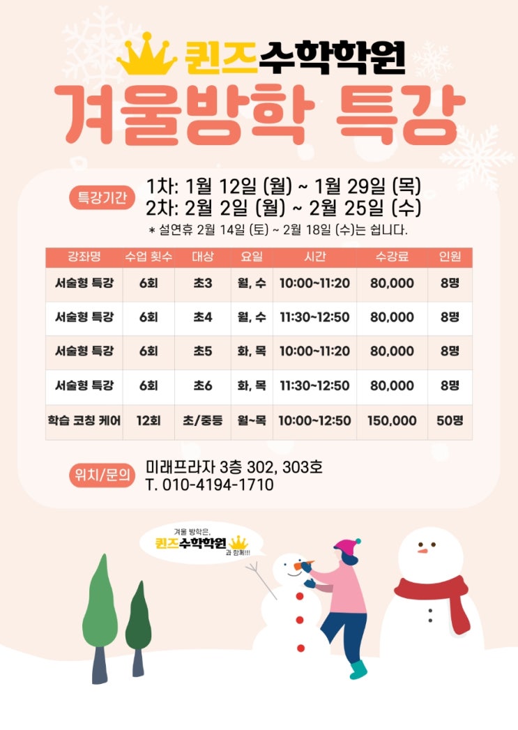 퀸즈수학학원 2026년 1,2월 겨울방학 특강 안내 ❄️