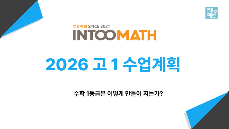 2026년 고1 .. 인투매쓰 수업내용과 학습plan은? 2026년....고1은 드디어 수험생이 되는 첫해입니다. 고1-1학기 1차 지필은 고등학교 3년 중 가장 치열한 내신 등급경쟁을 보입니다. 많은 시행착오도 일어납니다. 고1을 처음 맞이하는 학생과 학부모님들을 위해 1년간 가야할 길을 잠시나마 보여드리고자 글을 올립니다. 2026년 고1 학습 plan 시기별 학습전략은 학생의 성장에 따라 달라지게 됩니다. 1학기는 수험생이 되기 위해 무엇을 해야 하는가를 배운다면, 2학기는 수험생으로 어떤 공부를 해야하는가를 본격적으로 배우게 됩니다. 공든 탑이 무너지랴?? 모든 학생이 모든 step을 완료하지는 못합니다. 진정으로 열심히 하는 학생이 단 1명....... <img src="https://blogthumb.pstatic.net/MjAyNTEyMDdfMjE4/MDAxNzY1MDg4MTE0MDk3.nvOjuohRs_jx8wH15RCM1ISbnv3G-uz3IgYOESMMpyUg.7wrAmI_pygSSRe9XtcwPeEpNIqECZLQJRGiNauVnoP8g.PNG/1.png?type=s3" />