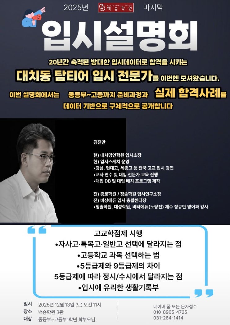 2025년 마지막 입시설명회 안내 “입시는 알고 접근해야 합니다. 우리는 데이터로 이야기합니다.” 안녕하세요, 백승학원입니다. 지난 입시설명회는 정말 큰 관심을 보내주셔서 빠르게 마감되었고, 참석하신 많은 학부모님들께서 “정확한 정보를 얻을 수 있어 좋았다”는 말씀을 전해주셨습니다. 관심과 믿음에 진심으로 감사드립니다. 이번 설명회는 대치동에서 다년간 데이터를 축적하고 실제 합격 사례를 다수 보유한 전문가를 초청하여 진행됩니다. 학부모님들께서는 흔히 접하기 어려운 실제 데이터와 사례 중심의 정보를 편안하게 들으실 수 있을 것입니다. 백승학원은 설명회 참여 시 별도의 개인정보를 요구하지 않습니다. 부담 없....... <img src="https://blogthumb.pstatic.net/MjAyNTEyMDlfNSAg/MDAxNzY1MjUzNzk2NjE3.rlaxGMOVUi0vrErlx6lRC69Hos5XF9mKXzDdiE_rxnIg.Tsx0C_6bs16AtoaDVa-7R3kyOOh2cyLUsYOUg4CJ5HEg.JPEG/%C1%A6%B8%F1%C0%BB_%C0%D4%B7%C2%C7%D8%C1%D6%BC%BC%BF%E4._%2832%29.jpg?type=s3" />