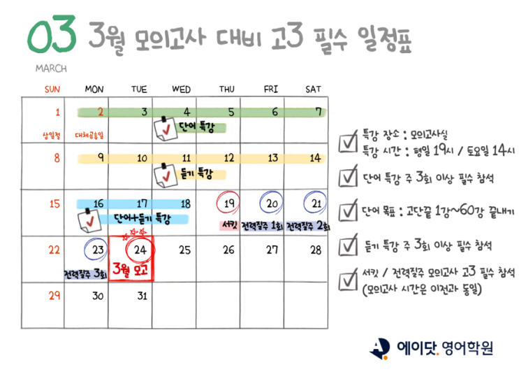 3월 24일 모의고사를 앞두고 학생도, 학부모님도 걱정이 많으시죠?! 3월 모의고사는 고1에게는 첫 실력 점검 고2에게는 중간 점검 고3에게는 수능의 출발점이 되는 중요한 시험이기 때문입니다. 그래서 저희 에이닷 용인 수지점이 불안감을 덜어드리고자 특강을 열었습니다! 이번 글에서는 3월 2일~3월 23일까지 진행되는 특강을 소개해 드릴게요 :) [ 1주차 : 단어 특강 ] -고단 끝 1-60강 외우기 목표 -최소 주 3회 참여 필수 -매일 10강/20강/30강씩 보는 학생 나눠서 진행 평일 19시/ 토요일 14시 시작으로 각 학생의 실력에 나눠서 진행되니 부담 없이 단기간 단어 실력을 향상시킬 수 있을 것입니다. [ 2주차 : 듣기특강 ] -작년 수능완성....... <img src="https://blogthumb.pstatic.net/MjAyNjAyMjZfNyAg/MDAxNzcyMDk2MDkzODQz.6_P8hVFQhPAcddhbEpu-fRX66MJSK_FqDnhuPX0MG4Qg.k_cIqvHr0zMyEx4TjFVP7Ssu4Q9zkPm-qU4fd4VFBr8g.PNG/IMG%A3%DF0421.PNG?type=s3" />