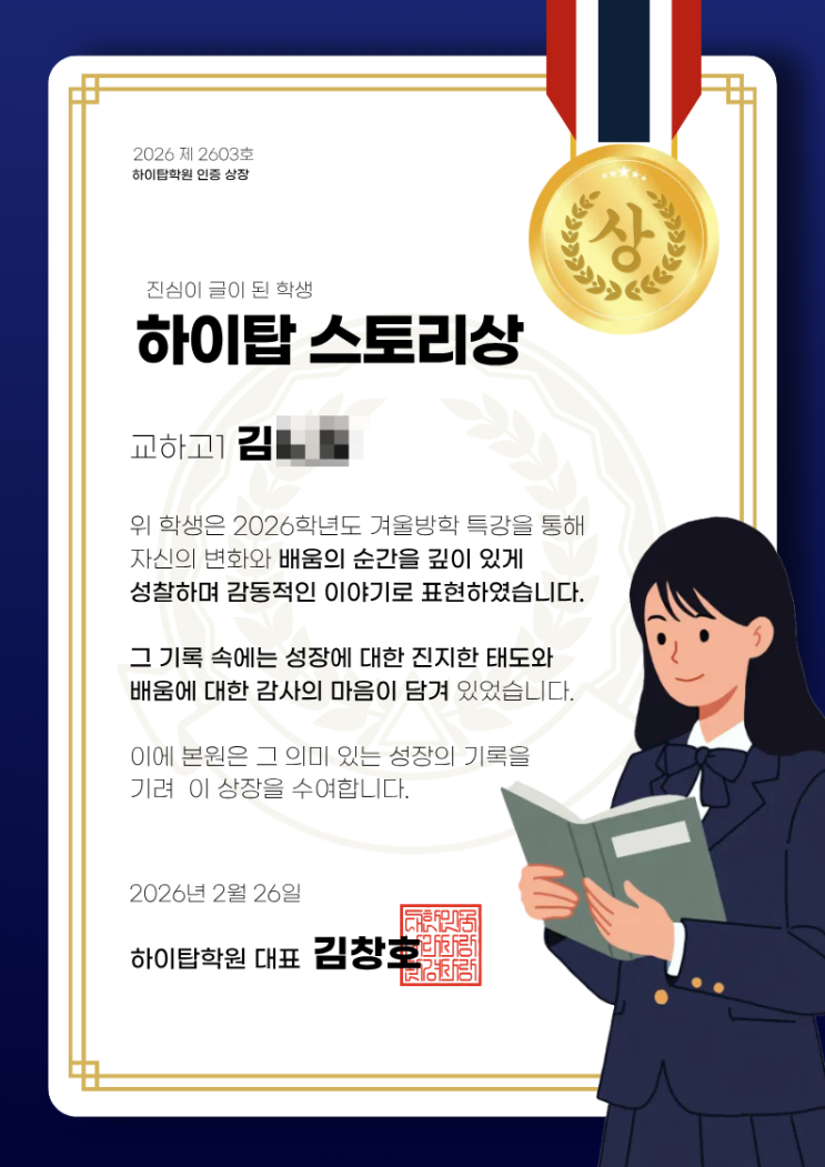 오늘의 노력은 내일의 입시 경쟁력이 됩니다 하이탑은 결과가 아닌 과정을 설계합니다 겨울방학 특강이 마무리되었습니다 차가운 계절이었지만, 하이탑 안의 교실은 누구보다 뜨거웠습니다 이른 아침부터 스터디카페에서 자기주도학습과 쉽지 않은 영어 지문과 수학 문제들 포기하고 싶었지만 다시 펜을 잡았던 순간들 이번 겨울은 단순한 선행 특강이 아니었습니다 아이들이 스스로를 넘어선 시간이었습니다 그리고 그 시간을 기록하는 자리, *겨울방학 특강 후기 공모전*을 진행하였습니다 아이들이 직접 말하는 성장 후기를 읽으며 저희가 가장 크게 느낀 것은 "아이들은 이미 스스로 알고 있었다"는 사실입니다 ✔ 예전보다 문....... <img src="https://blogthumb.pstatic.net/MjAyNjAyMjdfMjgw/MDAxNzcyMTczMzgxMjM3.AcnznQSn8hyracsyaqQO4PJC53oY0qB-FvG6aXIBKL4g.zxbtiP-CNdWAtZZpf0nSJIT-XJvps8Q7Y2ZLJthLUXUg.PNG/%BB%F3%C0%E5_%283%29.png?type=s3" />