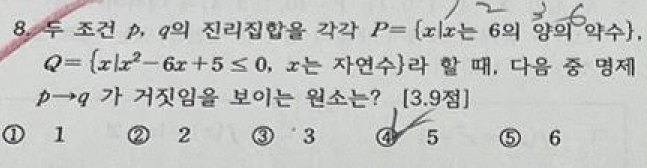 안녕하세요 탐스 전주여고전문 수학쌤입니다. 오늘은 전주여고 1학년 공통수학2 명제 기출문제를 풀어보겠습니다. ㅡㅡㅡㅡㅡㅡㅡㅡㅡㅡㅡㅡㅡㅡㅡㅡㅡㅡㅡㅡㅡㅡㅡㅡㅡㅡㅡㅡㅡㅡㅡㅡㅡ p와 q의 진리집합을 정확히 구한 후에 집합의 포함관계를 분석해주면 풀리는 간단한 문제입니다~ 하지만 이차부등식이 포함되어 있어 수학(상)을 열심히 공부하지 않은 학생들은 어려울 수도 있었을거같은데요~ 먼저 진리집합 P를 살펴보겠습니다. 진리집합 P에는 6의 양의 약수가 들어가므로 {1,2,3,6}이 된다는 것을 알 수 있습니다. 조금 어려운 부분이 Q인데요 1학기에 배웠던 이차부등식을 통해 알아낼 수 있습니다. x^2-6x+5를 인수분해하면 (x-1)(x-5)....... <img src="https://blogthumb.pstatic.net/MjAyNjAzMDFfMTE0/MDAxNzcyMzY5OTAxNDg5.wAVE1i4jWugeFSogLXGf3tv6oyK08YSigv3qsF5t8Rcg.jtq0nUN1KImrNQ2UGlF-ZwvgDOeGW1_vxCmTWJJdONcg.PNG/20240204_204248.png?type=s3" />