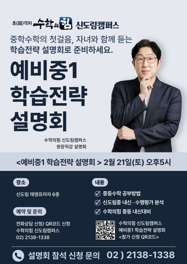 수학의힘 신도림캠퍼스 <예비중1 학습전략 설명회> 개최 안녕하세요, 수학의힘 신도림 캠퍼스입니다. 최근 수학의힘 신도림캠퍼스에서는 초등학교 졸업을 맞은 재원생들을 위해 <졸업축하 이벤트>로 케이크와 롤링페이퍼를 준비해 졸업을 축하하는 시간을 가졌었는데요. 졸업의 기쁨을 나눈 뒤, 이제는 중학교 입학을 어떻게 준비해야 할지, 정확한 방향을 잡아주는 시간이 필요하기 때문에 <예비중1 학습전략 설명회>를 진행하게 되었습니다. 초등학교 졸업과 함께 중학교 입학을 앞둔 우리 예비 중1 학생들, 학부모님들의 설렘과 걱정을 덜어드리기 위해 수학의힘 신도림캠퍼스에서는 지난 2월 21일 토요일, <예비중1 학....... <img src="https://blogthumb.pstatic.net/MjAyNjAyMjNfMTI0/MDAxNzcxODI3ODI3NjY1.w1F-zqtHV1thLQZPafk_cYbtYZS40pX7wX9vOHzr2Bgg.hB0KGHQNiwWTi_LHXoPcSVh6uVfCbPmGReISI8o_1ucg.JPEG/%BC%B3%B8%ED%C8%B8_%C0%FC%B4%DC%C1%F6_A4%BB%E7%C0%CC%C1%EE-_%BA%B9%BB%E7%BA%BB.jpg?type=s3" />