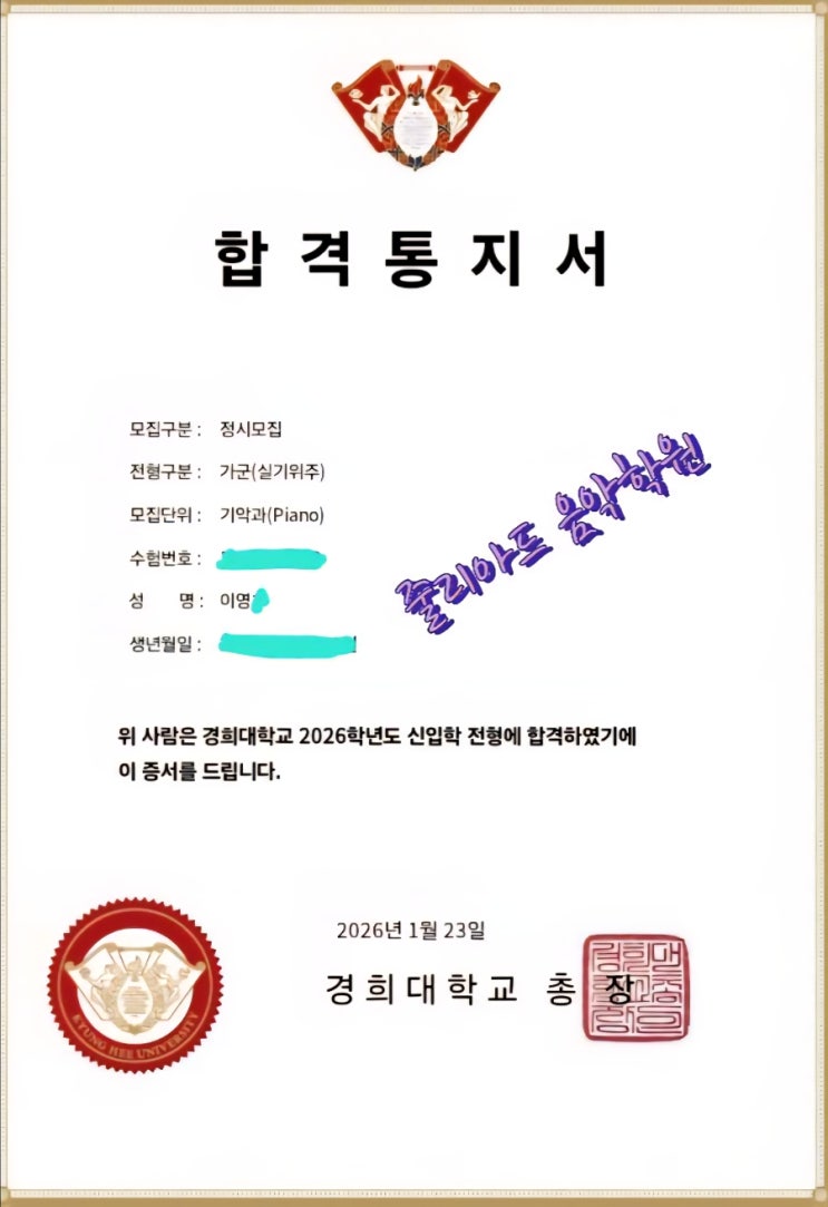 2026년 경희대학교 피아노 정시에 이 영*(중앙고 3) 학생도 최초 합격 했습니다. 2026년 경희대학교 피아노 정시에 2명의 학생을 합격 시켜서 2배로 기쁘네요~ * 이영* 학생은 일반고를 다니는 학생이었다. 중1정도까지 피아노를 배웠고. 피아노 입시 레슨도 받지 않았고. 피아노가 좋아 집에서 혼자 피아노를 치는 정도여서 2024년 고2 봄에 나를 찾아왔을 때는 아이의 실력을 가늠할 수도 없었다. 입시 레슨을 시작하고 선생인 나는 속으로 걱정이 많이 됐다. 먼저 쇼팽과 Op.10 No.1을 연습해오라 숙제를 내줬다. 음~~~~ "음악성이 있네" 단번에 느낄 수 있었다. 음악성과 테크닉을 어느 정도 파악하고 바로 무대 경험을 위해 콩쿨....... <img src="https://blogthumb.pstatic.net/MjAyNjAxMjVfMjQ1/MDAxNzY5MzA1NzEwNzIz.bO_5K9xp6wSyCmM_R9cYErLpBFGz4JgdshZ00J-tT_Yg.mqZIGpBjtL6mKt78GR5AZTmWquycPtxkcx6pVEmVOVUg.JPEG/900%A3%DF1769217004099.jpg?type=s3" />