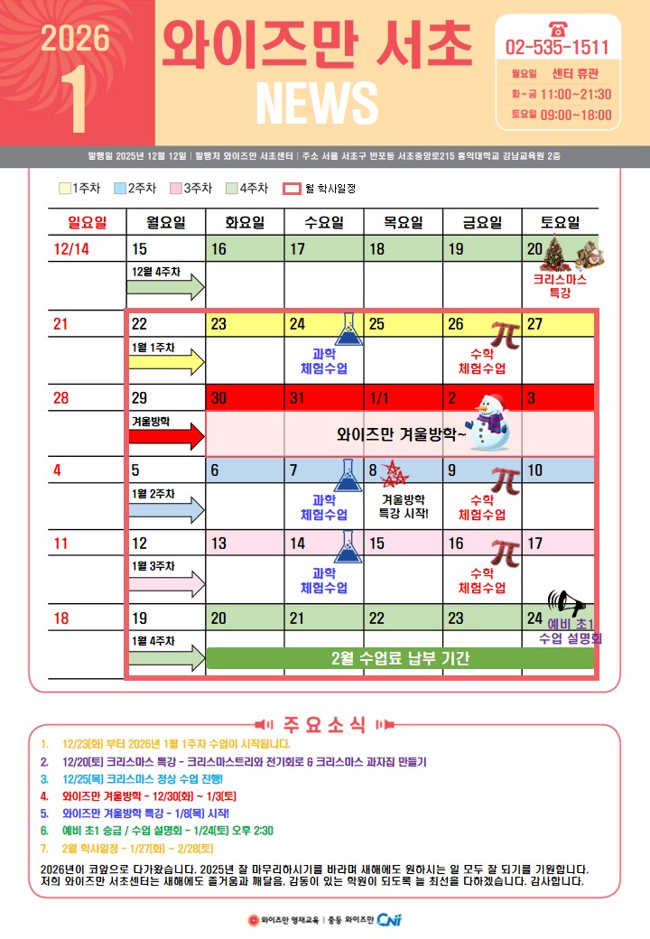 안녕하세요 와이즈만 서초센터입니다^^ 2026년 새해 첫 소식지를 전해드립니다. 학년 승급 후 첫 수업이 진행되었고 새로운 단계의 커리큘럼으로 흥미로운 수업이 이루어지고 있습니다. 본격적으로 1월 학사일정이 시작하기 전 12월 20일 토요일에는 크리스마스 기념 두가지 특강을 진행합니다. 크리스마스 당일에는 정상수업을 진행하고 그 다음주인 12월 30일 화요일부터 1주일간의 방학으로 수업이 없습니다. 신나는 겨울방학을 보내고 나면 와이즈만 서초센터의 겨울방학 특강이 시작되어 다양하고 흥미로운 주제의 수업들을 경험해볼 수 있습니다. 1월 24일 토요일에는 예비 초등 1학년 학부모님들을 대상으로 수업 설명회를 진행할 예정이....... <img src="https://blogthumb.pstatic.net/MjAyNTEyMTJfNjEg/MDAxNzY1NTI2MDYzNjM3._VRhedyF2b9lkzvAFVbS0B5_Kwlh-bO81qys_drOefMg.QJEZhlxF5_blRw2ketd-EqDLeY5ZxF0y_N-TY72g2GIg.JPEG/%BD%BD%B6%F3%C0%CC%B5%E51.JPG?type=s3" />