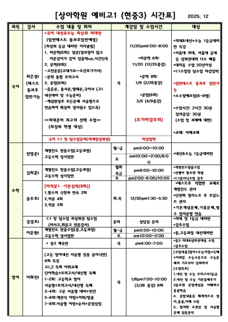 홍성민영어 고등부 <원장직강> 수능반 클래스 VERIFIED 대치 20년, 다수의 수강생과 입결로 검증된 수업! 수능 내신 전문가 홍쌤이 당신의 영어 잠재력을 즐겁게 폭발시켜 드립니다. [수능실력반] 계속반 ▷대상: 예비고2~3 ▷시간: 수 7시~10시 [수능실전반] 12/20 개강 ▷대상: 예비고2~3, 최상위권 ▷시간: 토 4시~7시 ◈ 상담문의 ◈ 상담 및 예약문의는 학원으로 연락주시기 바랍니다 -본원 02) 2052-0582 (한티역 롯데백화점 뒤) <img src="https://blogthumb.pstatic.net/MjAyNTExMTdfMTgz/MDAxNzYzMzY3ODkyODE5.FNFtmTsYpulSbvbsR88z6feTL_rz3aSMVPIC0ZK4qUwg.SVATxsag8k2wM_l964LsgbjdWW6gWpxKI2QWzfdol3Ag.JPEG/%B0%ED%B5%EE%BA%CE-%C0%A5-%C0%FC%B4%DC-%BD%E6%B3%D7%C0%CF-002_%282%29.jpg?type=s3" />
